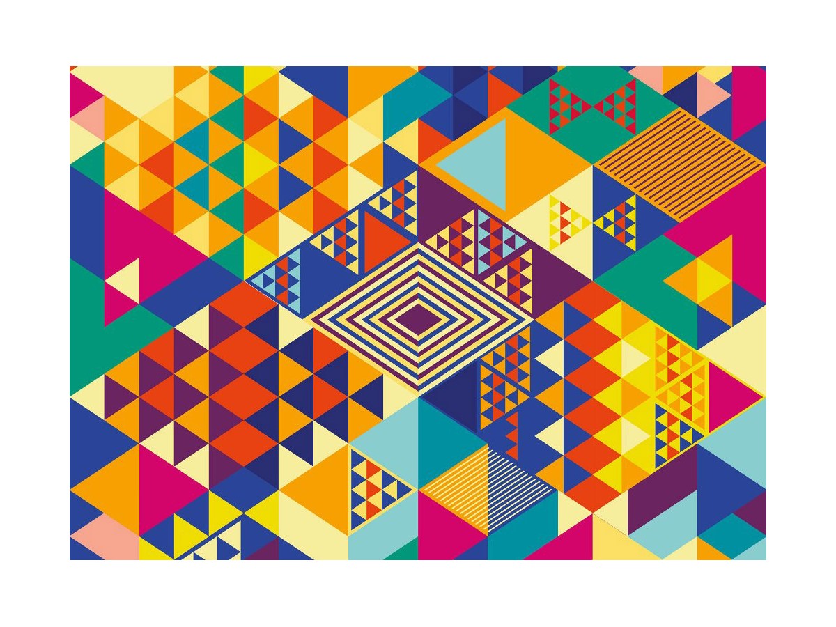 Imaginea afișată este o compoziție vibrantă, caracterizată printr-o varietate impresionantă de forme geometrice și culori. Motivele includ triunghiuri, dreptunghiuri, linii și cercuri, toate aranjate într-un tipar complex, creând un efect vizual captivant. Culorile sunt variate și intense, incluzând nuanțe de roșu, albastru, galben și portocaliu, care se contopesc armonios precum într-un colaj modern. Este remarcabilă utilizarea contrastelor puternice și a repetiției pattern-ului central care formează un ochi vizual. Această ilustrație pare să fie o lucrare în stil abstract, concentrându-se pe dinamica și interacțiunea dintre forme și culori.