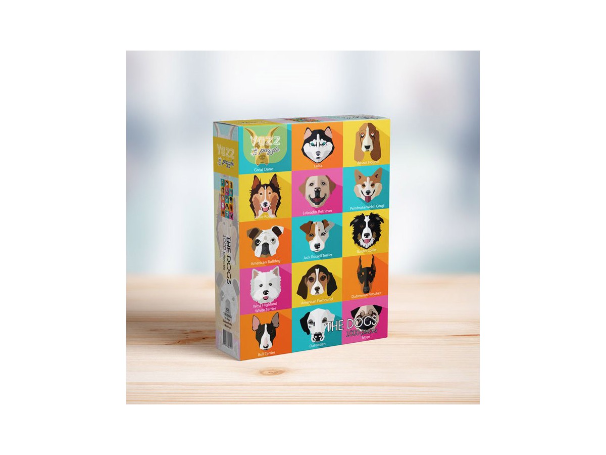Imaginea acestui puzzle 1000 piese Yazz - The Dogs (Yazz-3870) prezintă o serie de portrete stilizate ale diferitelor rase de câini, fiecare fiind plasat într-un fundal colorat distinct. Portretele sunt realizate într-un stil grafic simplu și modern, fiecare câine fiind reprezentat cu trăsăturile caracteristice ale rasei sale. De exemplu, un Danez Mare este ilustrat cu urechi lungi și expresive, în timp ce un Labrador Retriever este redat cu blana sa netedă și expresia prietenoasă. Culorile vii ale fundalurilor variază de la oranj la albastru, emfazizând individualitatea fiecărui câine.