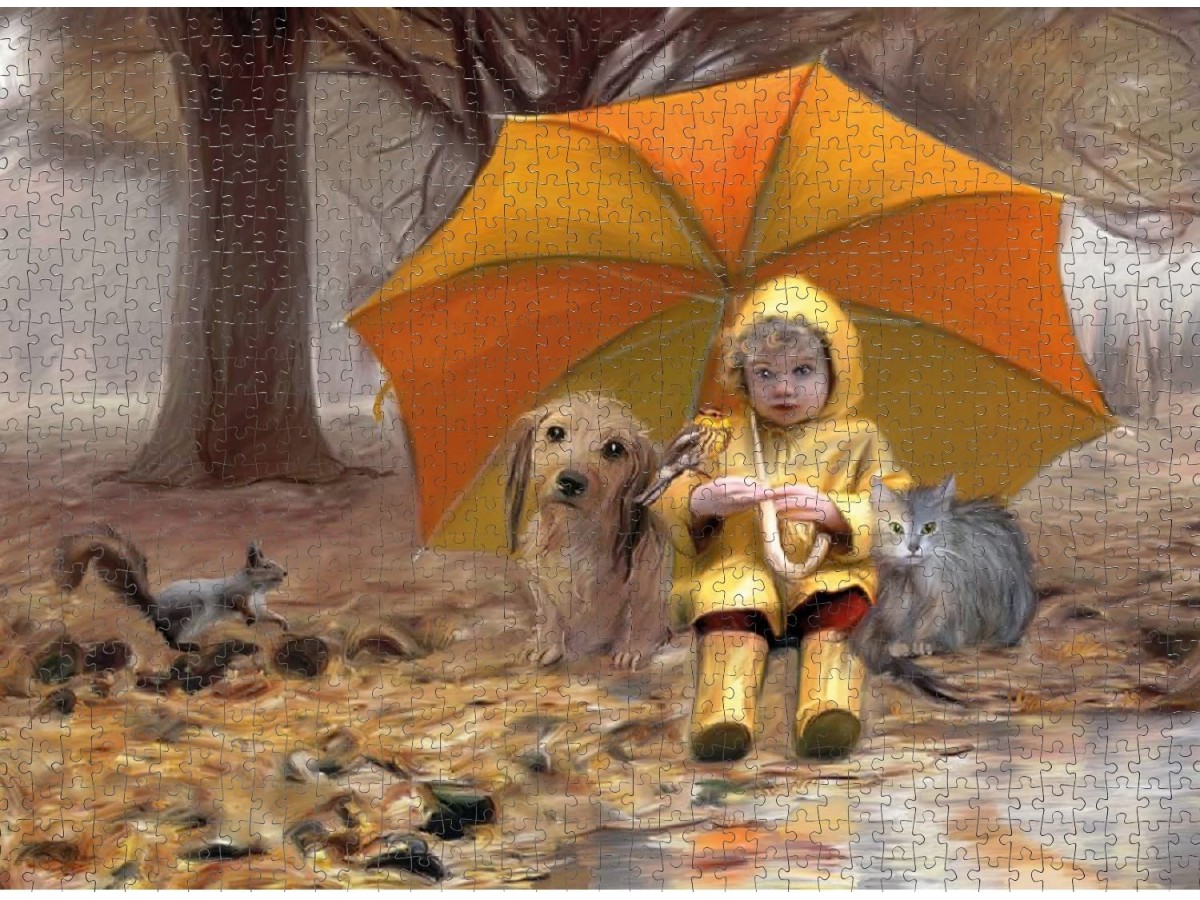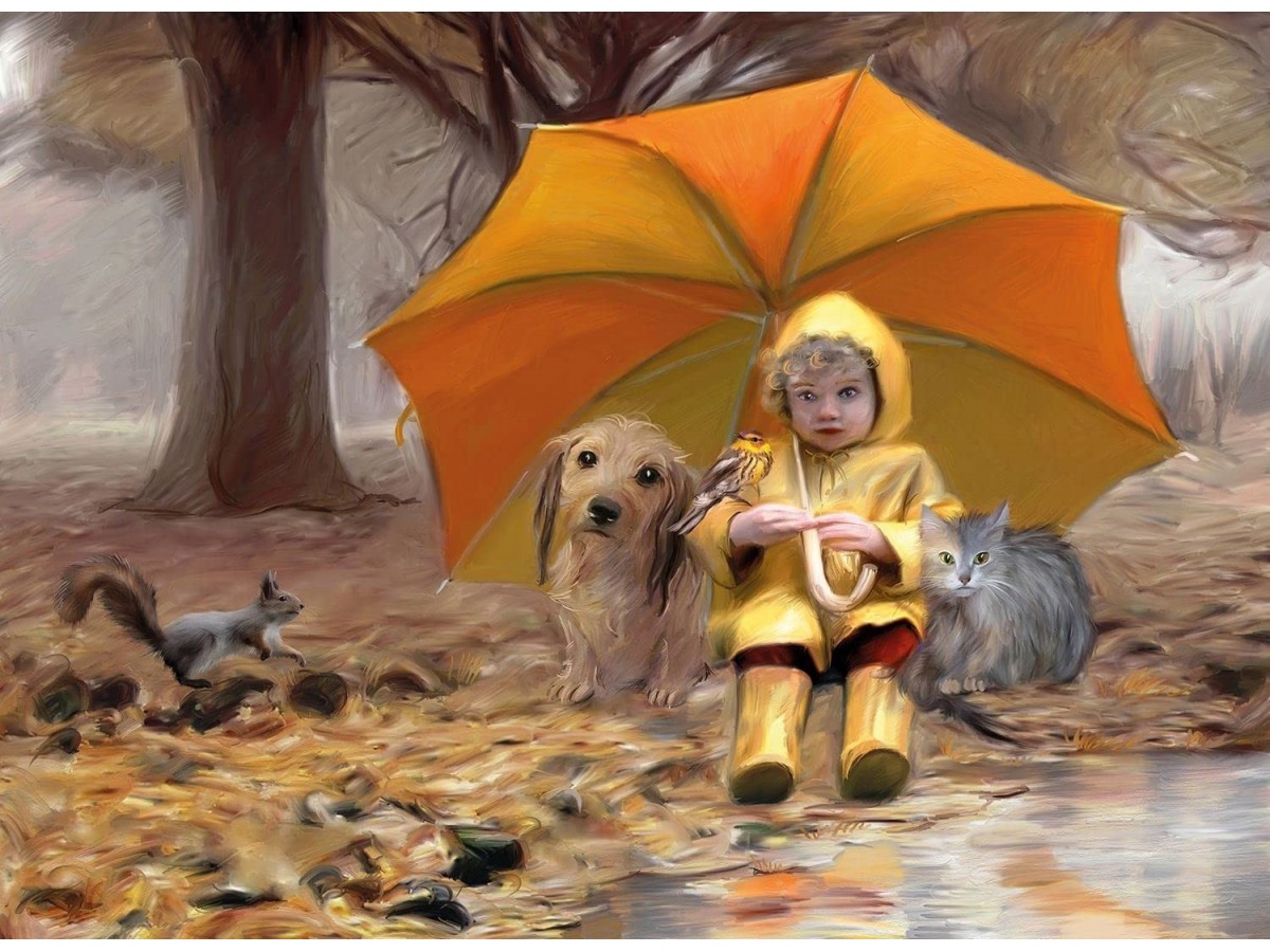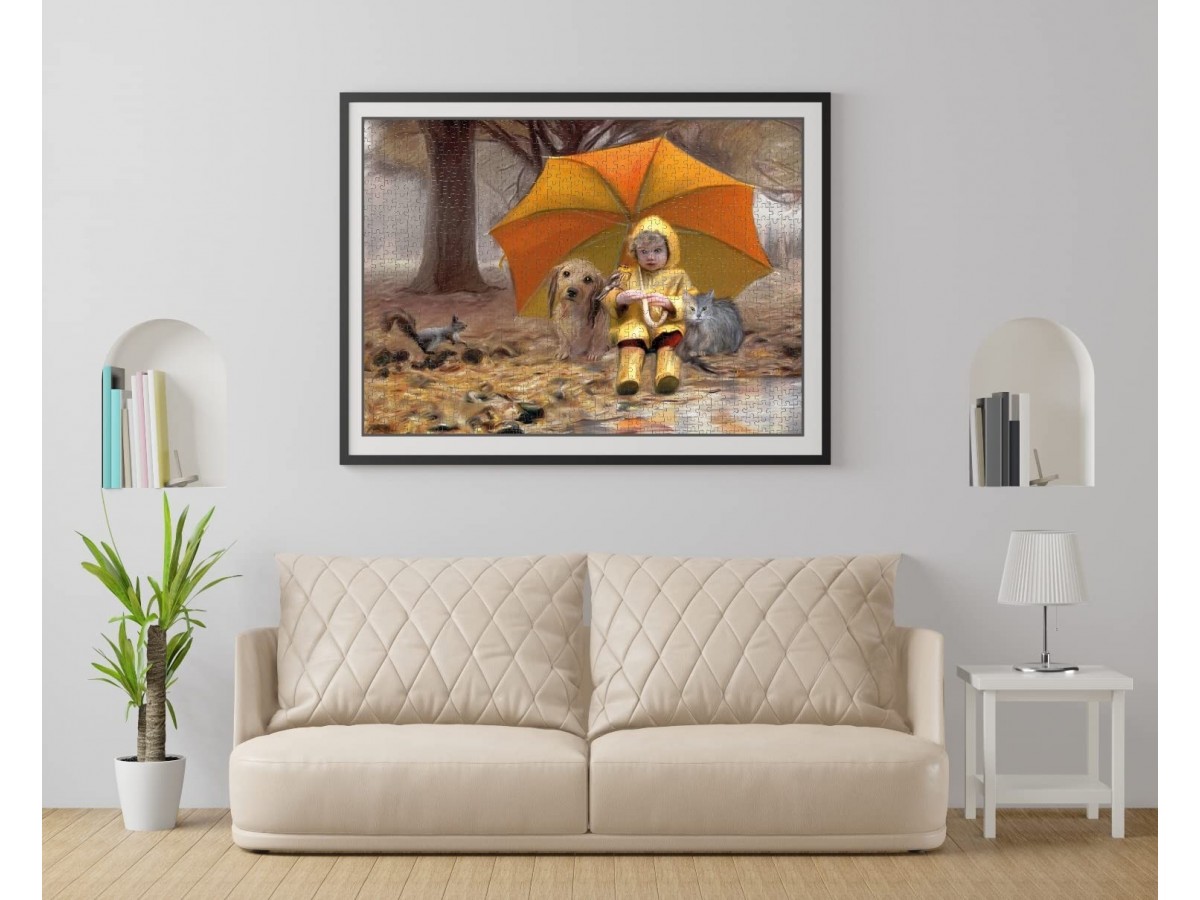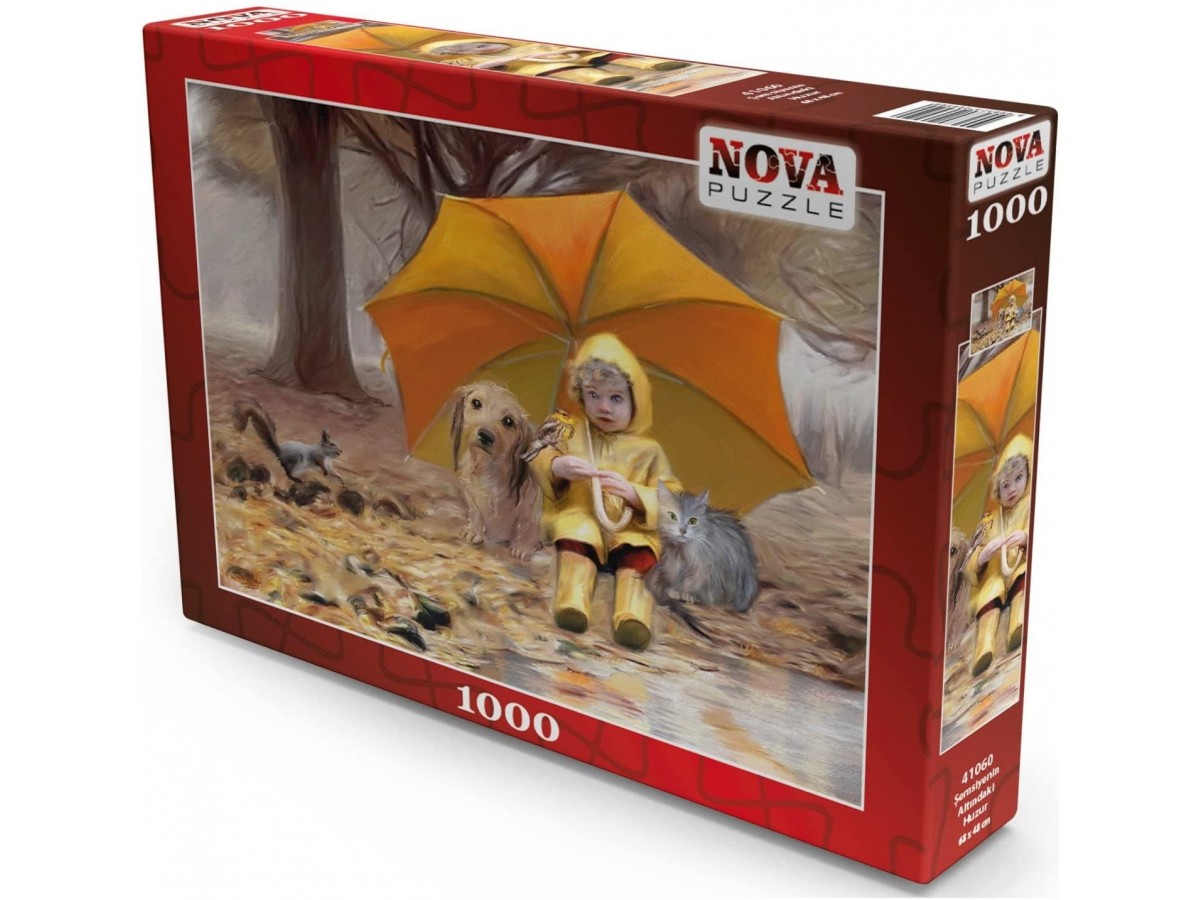 Imaginea reprezentată pe acest puzzle 1000 piese Nova - Under the Umbrella surprinde o scenă liniștită, unde o fetiță stă pe un trunchi de copac sub o umbrelă uriașă, galbenă. Ea poartă un pardesiu galben și cizme de aceeași culoare, fiind însoțită de un câine și o pisică. În fundal, se disting copaci dese și ceață, ilustrând o zi răcoroasă de toamnă sau primăvară.