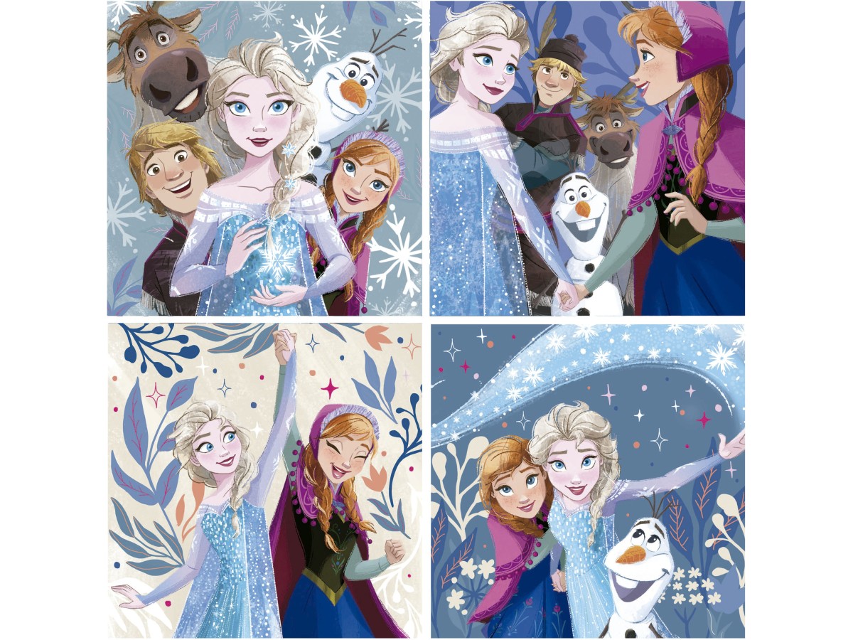Această ilustrație digitală este extrasă din filmul Frozen, produs de Disney, avându-le ca personaje principale pe Elsa și Anna, alături de prietenii lor, inclusiv Olaf, Sven și Kristoff. Imaginea este împărțită în patru panouri diferite, fiecare ilustrând interacțiuni calde și pline de afecțiune între personaje. În primul panou, toate personajele sunt îmbrăcate în haine de iarnă și zâmbesc larg, creând o atmosferă de bucurie. În cel de-al doilea panou, vedem o scenă intimă între cele două surori, zâmbind și privindu-se cu dragoste. Al treilea și al patrulea panou arată momente de sărbătoare, cu decoruri strălucitoare și confetti, amplificând sentimentul de festivitate și bucurie partajată.