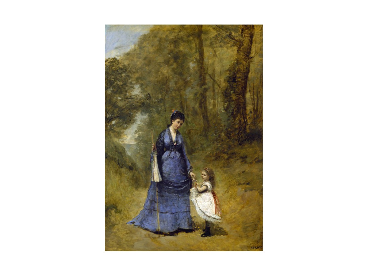 Această pictură a fost realizată de Jean-Baptiste Camille Corot în anul 1872 și poartă titlul 'Madame Stumpf and Her Daughter'. Opera ilustrează o scenă calmă și serenă, unde o femeie adultă, îmbrăcată într-o rochie albastră lungă și elegantă, stă în picioare pe o alee dintr-un parc. Ea ține de mână pe o mică fată, probabil fiica ei, care poartă o rochie albă și are părul blond. În spatele lor se vede un peisaj forestier, cu copaci foșosi și frumos texturați, ceea ce sugerează o zi calmă de primăvară sau de vară timpurie. Corot a capturat cu măiestrie momentul interacțiunii dintre cele două personaje, reflectând o atmosferă placidă și liniștită.