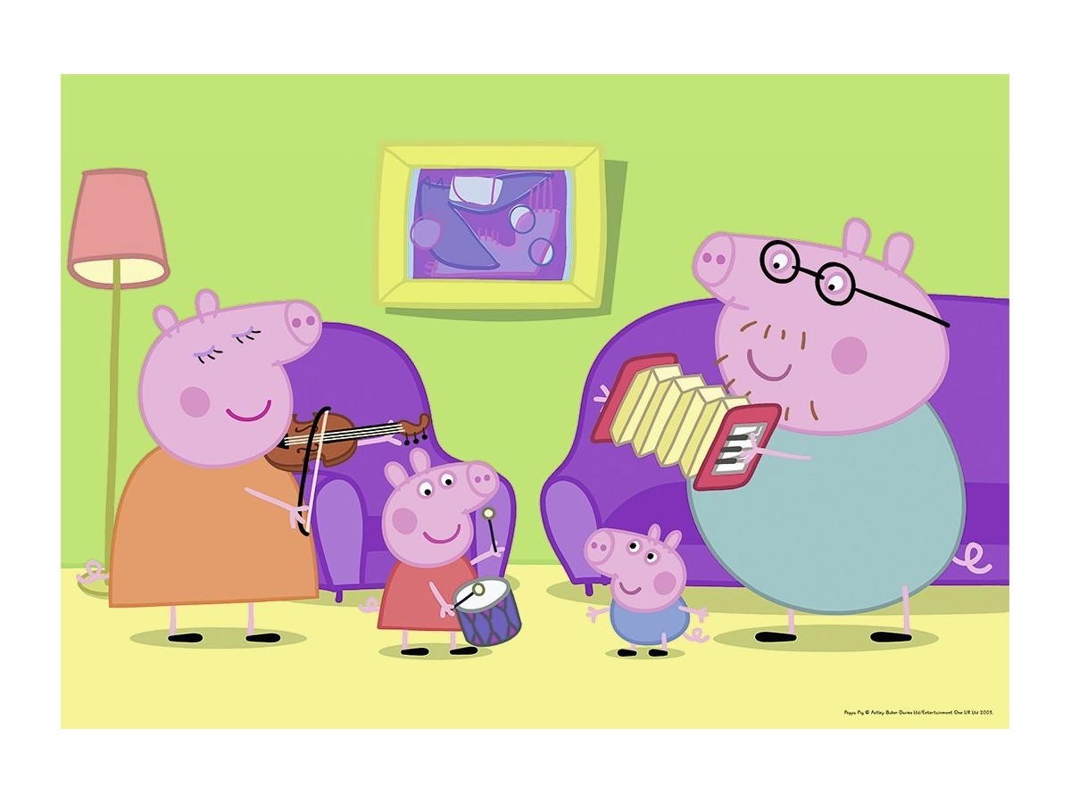 Imaginea ilustrează o scenă din serialul animat Peppa Pig, unde familia lui Peppa se bucură de muzică împreună în sufragerie. Peppa, îmbrăcată cu o rochie roșie, cântă la vioară. Alături de ea, fratele ei mai mic, George, are o toba albastră. Mama lor, care poartă o rochie portocalie, este încântată de muzica celor mici, aplaudând. Tata Pig, cu o cămașă verde și ochelari, cântă la acordeon. Fundalul este simplu, dominat de un verde deschis, cu un fotoliu mov și o lampă în tonuri de roz. Pe perete este o imagine înrămată cu familia Pig, adăugând un element de continuitate și familiaritate în scena domestică.