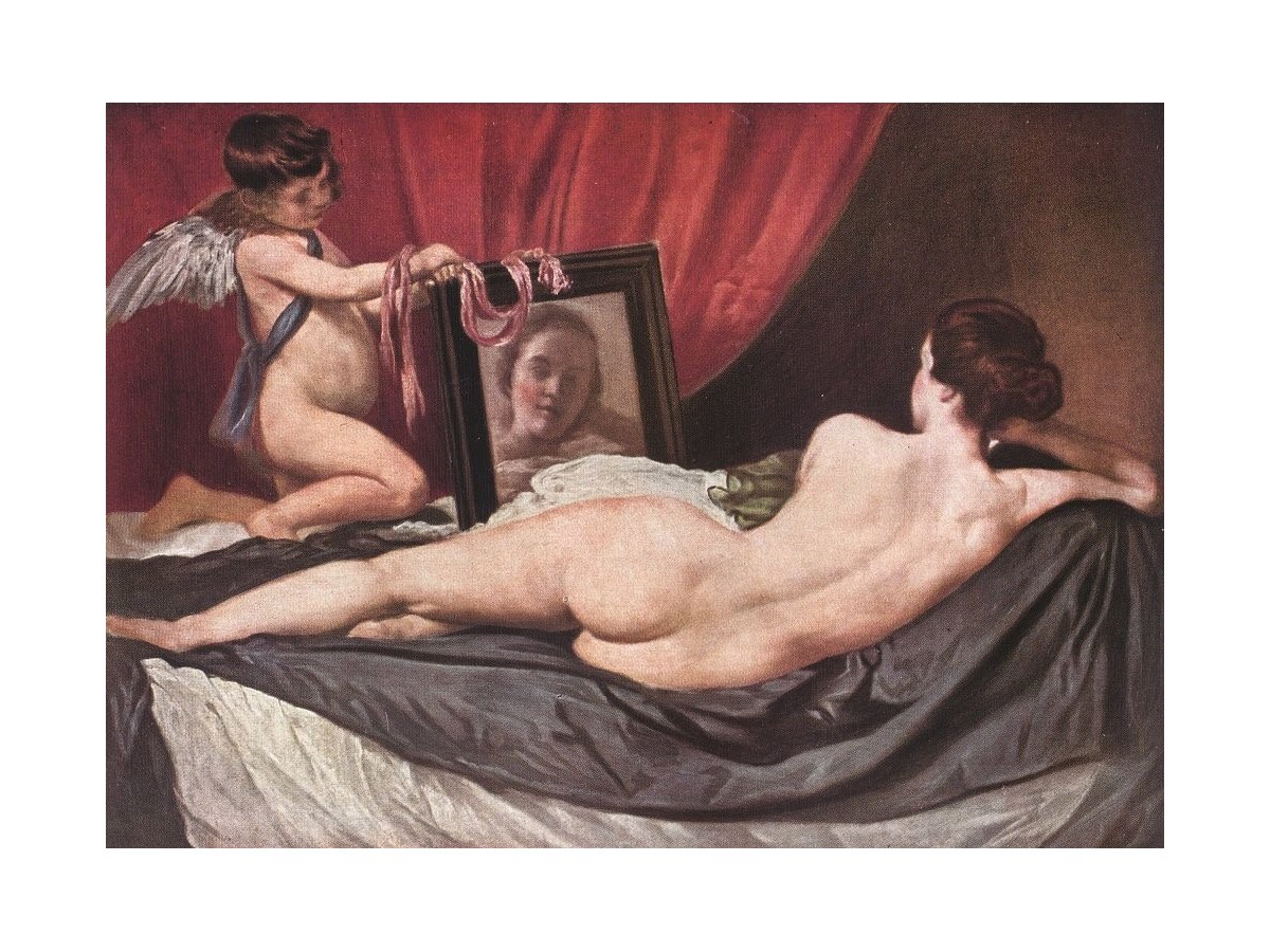 Opera de artă cunoscută sub numele de 'The Rokeby Venus' a fost pictată de artistul spaniol Diego Velázquez între anii 1647 și 1651. Aceasta ilustrează figura unei zeițe goale, Venus, întinsă pe o draperie de satin, privindu-se într-o oglindă ținută de Cupidon, zeul dragostei, care este reprezentat ca un putto cu aripi. Fundalul este dominat de o cortină roșie care contribuie la atmosfera intimă și privată a scenei. Reflectarea feței lui Venus în oglindă este neobișnuit de clară și detaliată, subliniind conexiunea dintre cele două personaje mitologice.