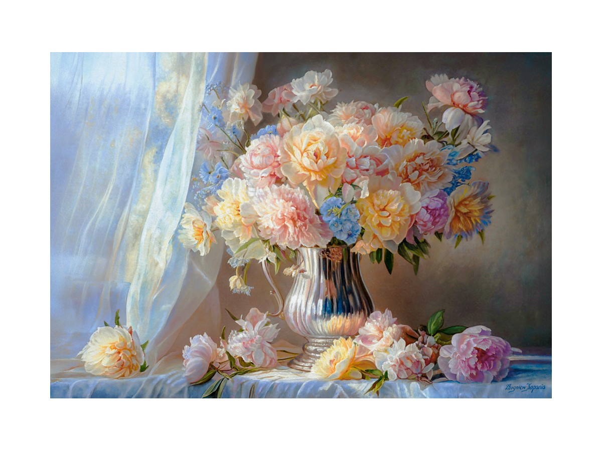 Imaginea puzzle-ului Castorland cu 1500 de piese din colecția Art Collection - Pastel Peonies surprinde un aranjament de bujori pastelați într-un vas de argint, pe o masă acoperită cu un material textil crem. Lumina naturală pătrunde prin fereastră, creând reflexii și umbre delicate peste florile și vasele aranjate cu atenție. Stilul realist al picturii evidențiază detalii precum reflexiile pe metal sau petalele colorate ale florilor, oferind o atmosferă calmă și elegantă.