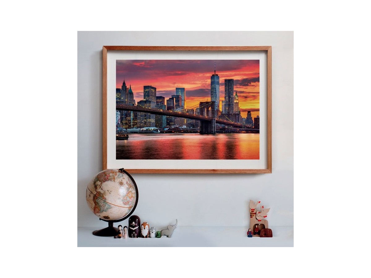 Imaginea puzzle-ului East River at Dusk de la Clementoni prezintă o scenă urbană vibrantă la amurg, capturând esența orașului New York cu răsăritul său emblematic. Zgârie-nori impozanți se înalță mândri, reflectându-se strălucitor în apele calme ale râului East River și adăugând o dimensiune hipnotică scenei. Luminile orașului încep să pâlpâie pe măsură ce cerul se colorează în nuanțe de roz și portocaliu, contrastând puternic cu siluetele închise la culoare ale clădirilor. Această ilustrație digitală este o reprezentare iconică a New York-ului, oferind o vedere spectaculoasă asupra Freedom Tower și altor clădiri semnificative din Lower Manhattan.