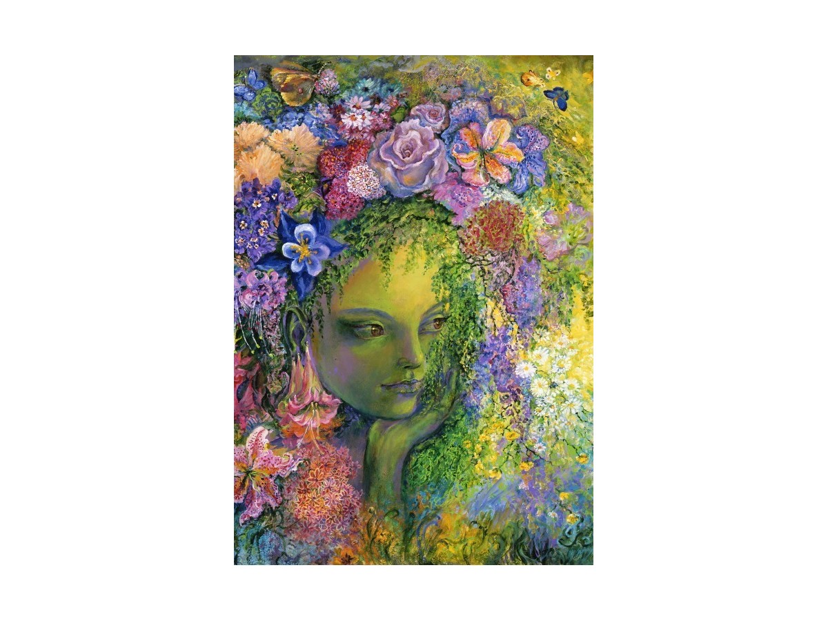 Imaginea ilustrează o pictură colorată și vibrantă care pare să fie o lucrare a artistei Josephine Wall, intitulată 'Queen of the May'. Scena prezintă un portret feminin stilizat, a cărui față pare să se contopească și să emane dintr-o abundență de flori de primăvară. Fața este pictată în nuanțe calmante de verde și galben, sugerând renașterea și revigorarea naturii în luna mai. Elemente florale, cum ar fi lalele, violete și iriși, se întrepătrund cu trăsăturile personajului, creând o simbioză între uman și natură. Fundalul picturii este bogat în tonuri de albastru și mov, adăugând o atmosferă mistică și visătoare compoziției.