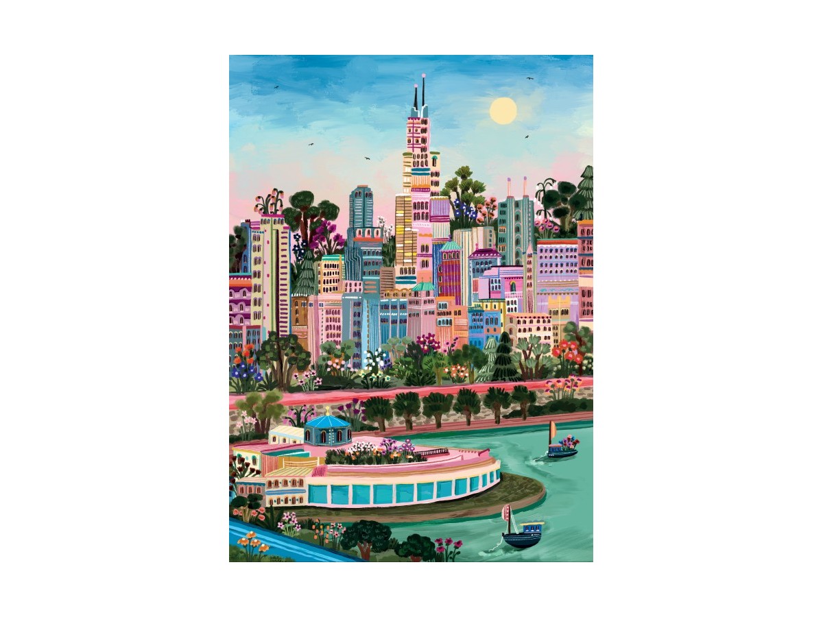 Imaginea ilustrează o reprezentare colorată și idealizată a orașului Chicago. În centrul compoziției se remarcă o serie de zgârie-nori stilizați, cu o paletă de culori ce variază de la roz la albastru, conferind un aspect vibrant și contemporan acestui peisaj urban. Prezența unui apus de soare adăugă o notă de liniște scenei, aruncând o lumină caldă peste clădiri. În partea de jos a imaginii, un râu traversează orașul, peste care sunt plasate mai multe bărci de agrement. Totodată, pe malurile râului se observă spații verzi bine întreținute, cu arbori și flori, ce contrastau plăcut cu verticalitatea zgârie-norilor.