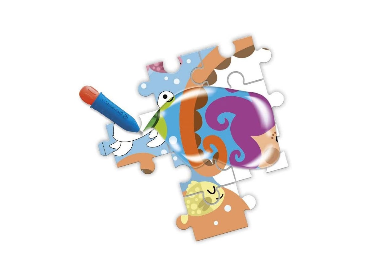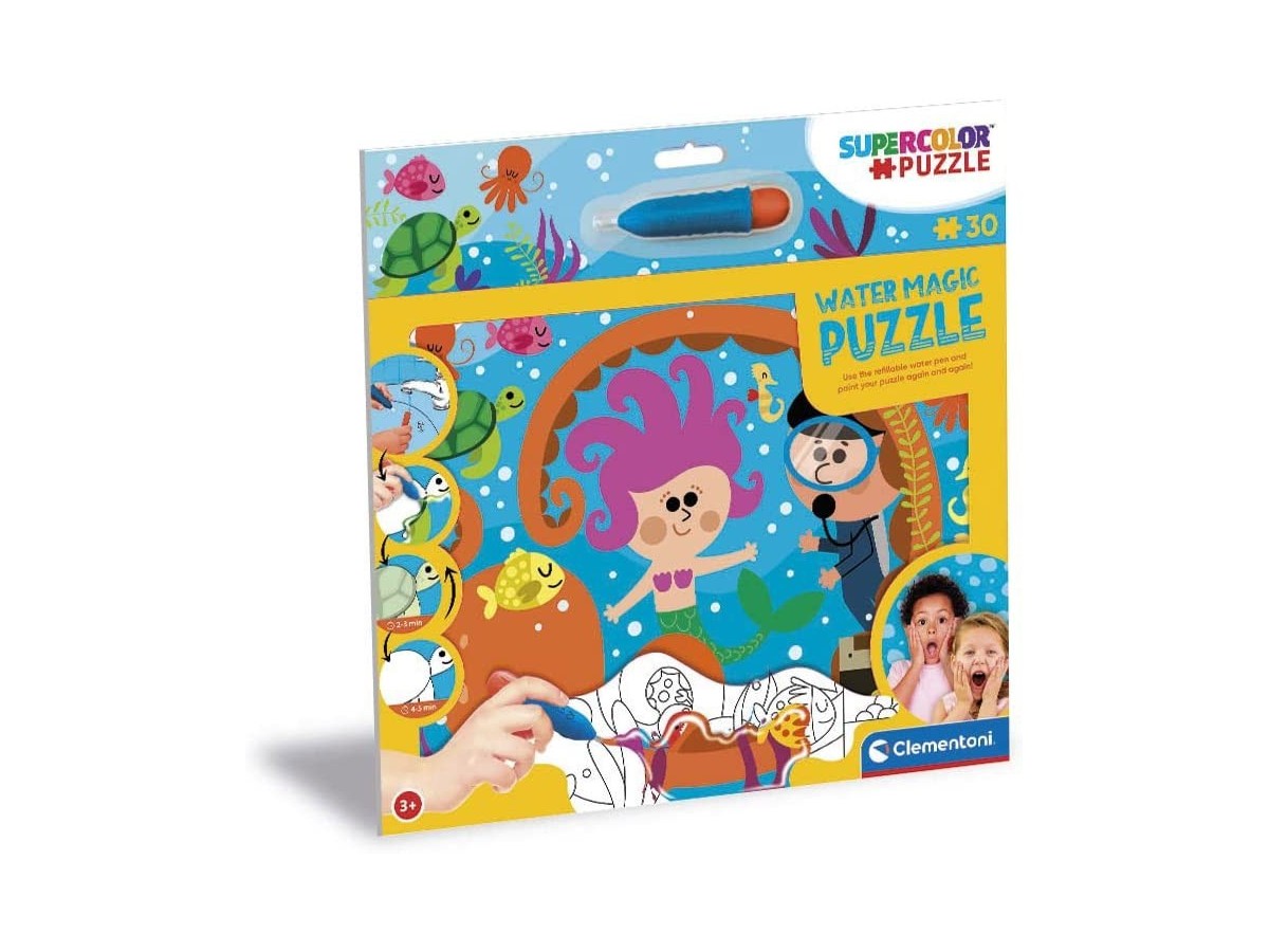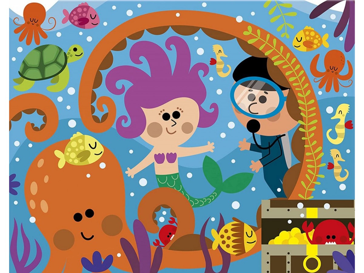 Imaginea surprinsă pe puzzle-ul Clementoni cu 30 de piese - Water Magic The Deep Sea (Clementoni-22709) te plasează în mijlocul unei scene subacvatice vibrante, plină de viață și culoare. În centrul atenției se află o sirenă cu părul mov și roz strălucitor, înconjurată de o varietate de pești în culori vii, de la galben strălucitor la albastru profund, care înoată jucăuș în jurul ei. Un copil cu o mască de scufundări explorează curios această lume subacvatică, adăugând o notă de aventură imaginii. La periferie, poți observa diverse specii marine, precum o caracatiță verde și o stea de mare portocalie, contribuind la frumusețea și diversitatea scenei.