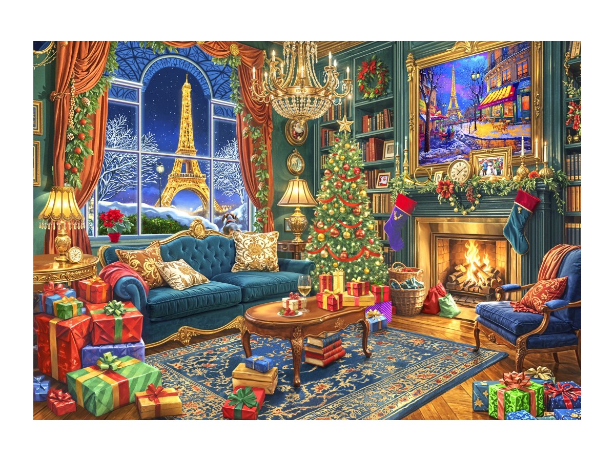 Imaginea prezintă o scenă festivă, plasată într-o cameră elegantă cu decor de Crăciun. În centrul compoziției, un brad de Crăciun magnific, împodobit cu luminițe și globuri colorate, domină peisajul. În partea stângă, o canapea albastră este orientată spre un șemineu pe care arde un foc viu, creând o atmosferă caldă și primitoare. Peste tot în cameră se regăsesc cadouri împachetate în hârtie strălucitoare. În fundal, o fereastră mare oferă o vedere impresionantă asupra Turnului Eiffel, sugerând că scena are loc în Paris. Ilustrația, plină de detalii și culori vibrante, este executată într-un stil foarte detaliat și realist, asemănător unei fotografii.