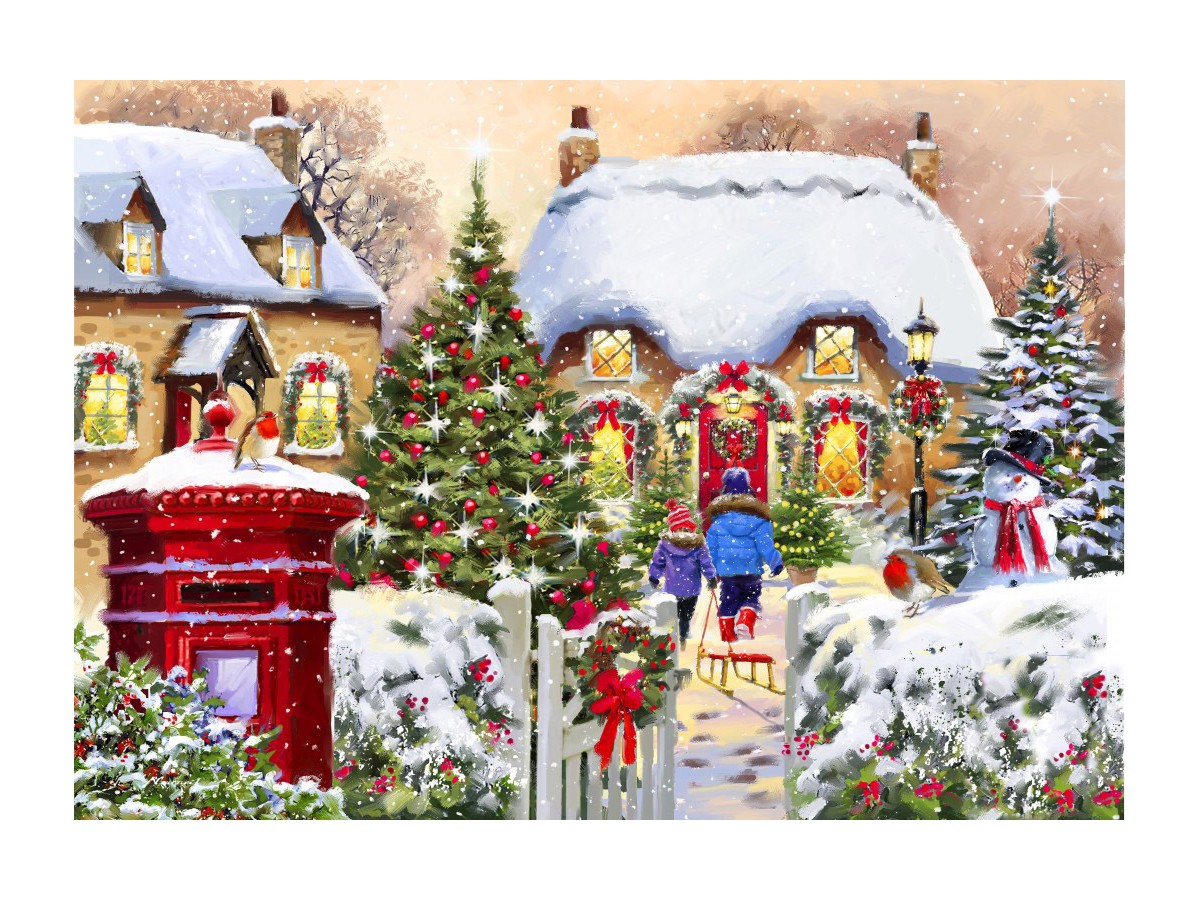 Scena captată în imagine este o ilustrație festivă ce reprezintă o scenă de iarnă într-un sat decorat pentru sărbători. În centrul compoziției se află o stradă acoperită de zăpadă, înconjurată de case cu acoperișuri încărcate de nea și ferestre iluminate cald, sugerând căldura și confortul pe care le oferă locuințele în frigul anotimp. Pe stradă, niște personaje, posibil locuitori ai satului, sunt îmbrăcate în haine de iarnă și par să se îndrepte spre o destinație festivă, subliniată de decorațiunile luminoase și brazii ornamentați din preajmă. Subliniază atmosfera sărbătorilor, în timp ce un om de zăpadă plasat strategic adaugă o notă de jovialitate scenei.