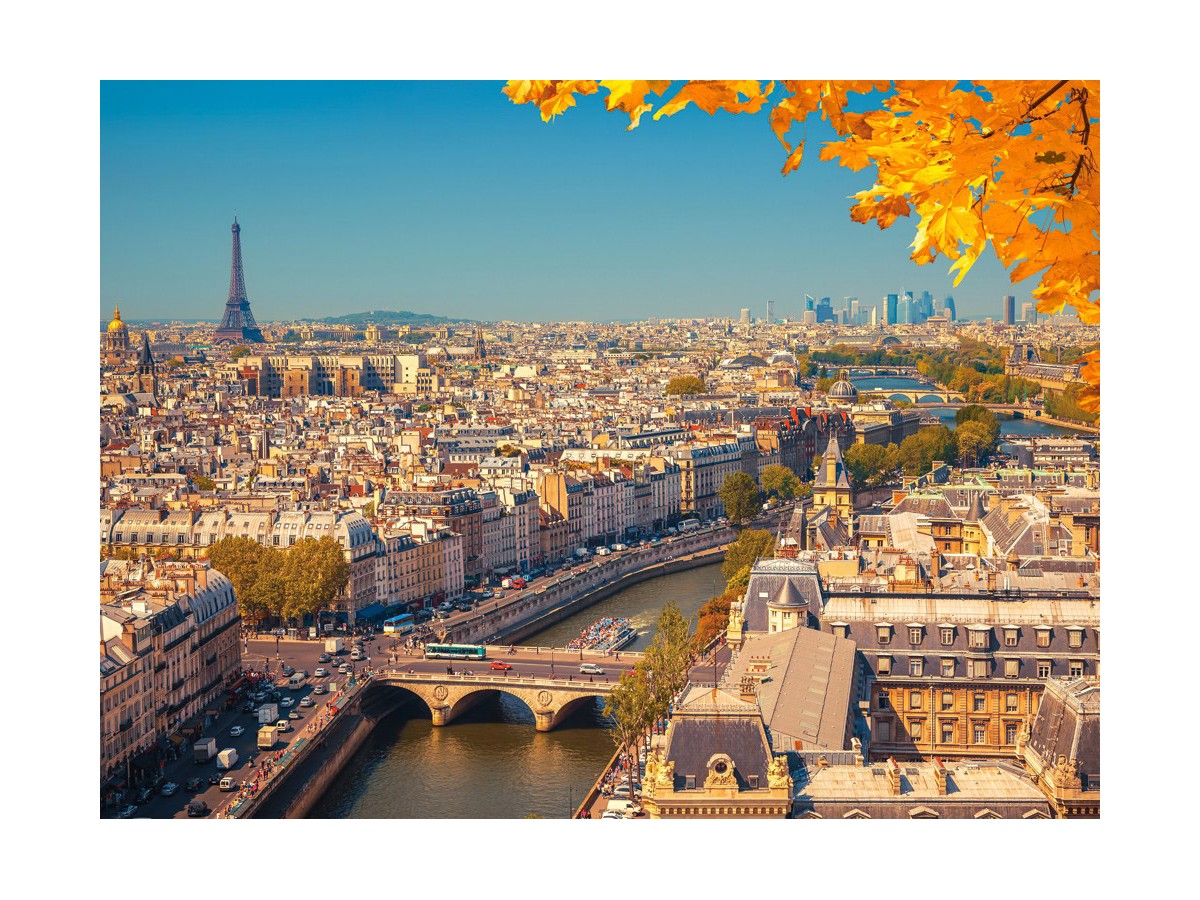 Această fotografie panoramică oferă o vedere spectaculoasă asupra Parisului, capturând esența orașului luminilor dintr-o perspectivă aeriană. În centrul compoziției, râul Sena serpuieste prin oraș, flancat de Număroase clădiri istorice, reflectând arhitectura distinctivă pariziană. În depărtare, dominând orizontul, se află Turnul Eiffel, un simbol recunoscut global al Parisului și al Franței. Imaginea este îmbogățită de culorile toamnei, cu frunze de un galben aure ce ramează scena, adăugând un contrast vibrant cu albastrul cerului senin de deasupra.