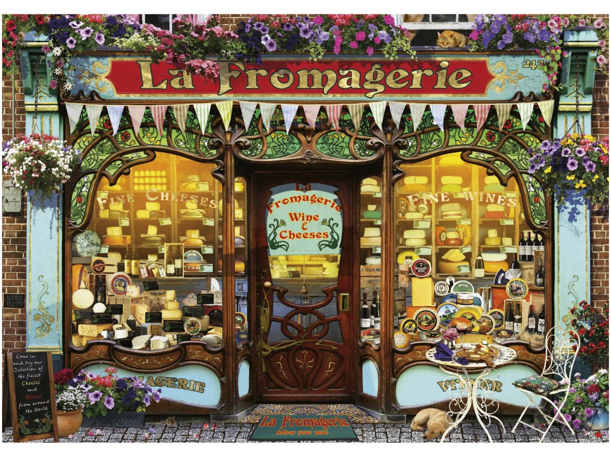 Ilustrând fațada pitorească a unui magazin de brânzeturi denumit 'La Fromagerie', puzzle-ul cu 2000 de piese Educa - The Fine Cheese Shop te transpune într-o atmosferă autentică și plină de farmec. Ferestre arcuite dezvăluie o varietate impresionantă de brânzeturi și alte delicatese, sub un semn atrăgător ce afișează deNumărea magazinului 'Fine Wines Cheeses'. Coloane înalte și ornamente florale completează tabloul vibrant, împreună cu detalii precum coșuri cu pâine și o bicicletă parcată elegant în fața magazinului.