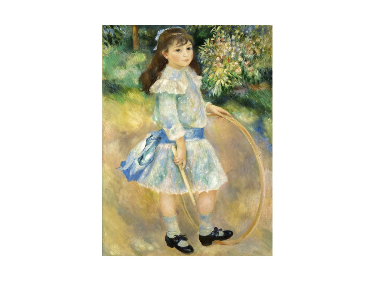Lucrarea 'Girl with a Hoop' este o pictură realizată de artistul francez Pierre-Auguste Renoir în anul 1885. Pictura în stil impresionist prezintă o fetiță într-o rochie albastră deschisă, cu detalii volanate și o eșarfă legată în jurul taliei. Ea ține în mână un cerc mare și se află într-un decor natural, cu un fundal de vegetație abundentă, imprimând atmosfera relaxată și spontană caracteristică impresionismului. Expresia fetiței este una calmă, privirea îndreptându-se spre privitor, în timp ce lumina soarelui filtrează prin frunziș, creând pete de lumină și umbră pe figură și pe îmbrăcăminte.
