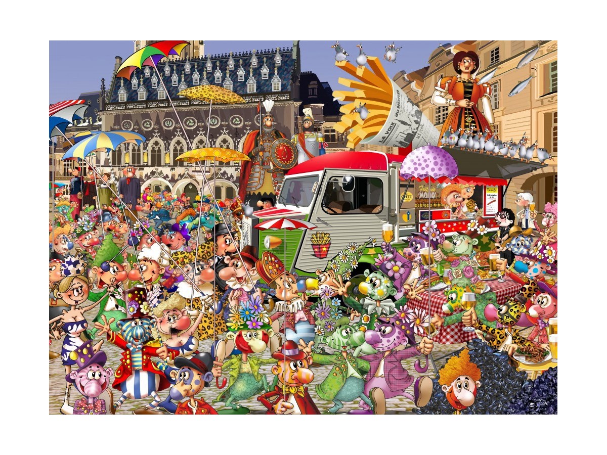 Imaginea puzzle-ului Grafika-F-30822 prezintă o scenă animată, colorată, plină de personaje caricaturale, care pare să se desfăşoare în timpul unui târg sau festival. Multitudinea de personaje, de la oameni la animale antropomorfizate, conferă un aer jovial şi dinamic. Scena este dominată de un camion de street food, un balon cu aer cald şi o roată Ferris, elemente care sugerează festivitatea şi agitaţia unei pieţe aglomerate. Arhitectura clădirilor din fundal evocă stilul european, adăugând un context geografic scenei, posibil un oraş din nordul Franţei, cum ar fi Lille, cunoscut pentru Braderia sa anuală.