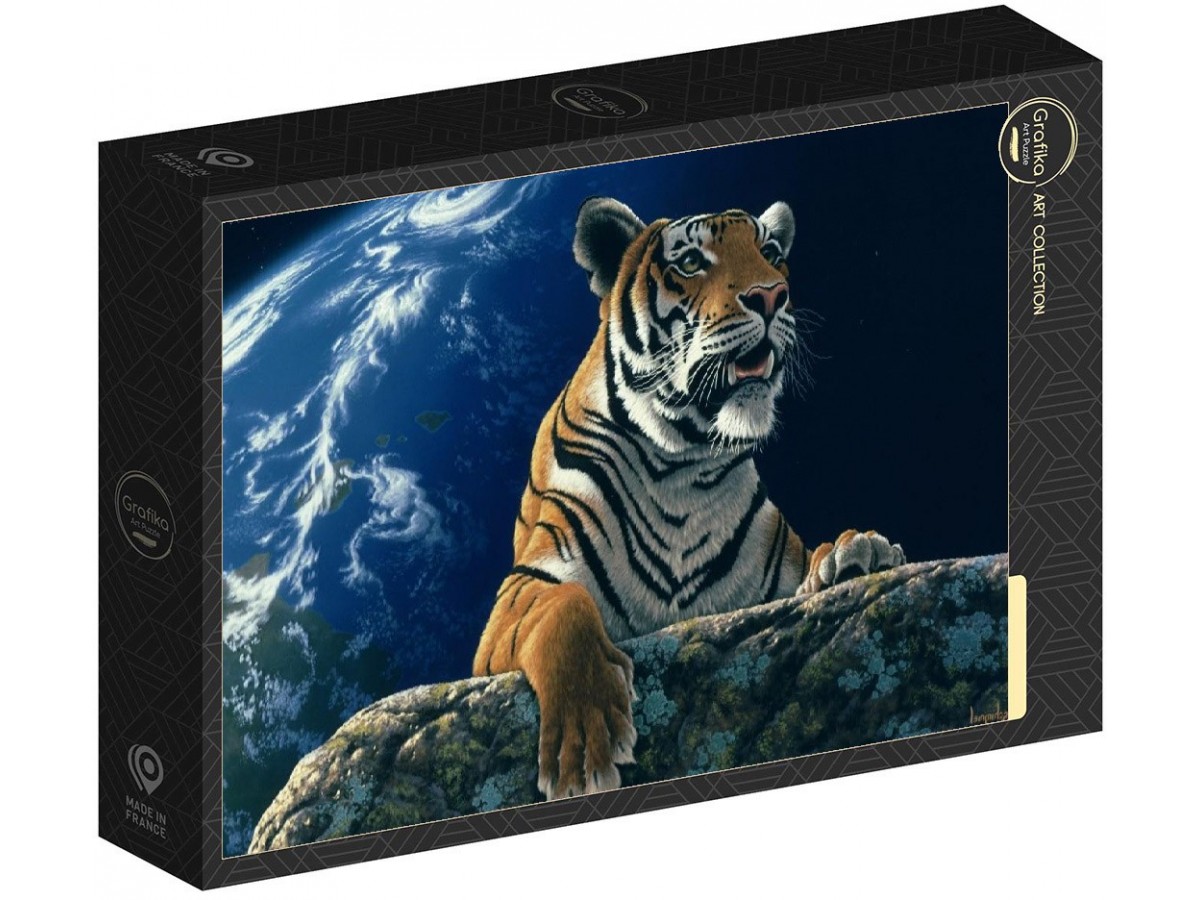 Puzzle-ul cu 2000 piese Grafika - Schimmel William: Only One Home surprinde o imagine uluitoare a unui tigru matur, cu blană elegantă și dungi pronunțate, așezat pe o stâncă. În fundal, Pământul poate fi văzut din spațiu, oferind un contrast uimitor între sălbăticia tigrului și imensitatea planetei albastre. Compoziția este realistă, cu o atenție deosebită la detaliile blănii și expresiei felinei, precum și la textura stâncii pe care aceasta se odihnește. Imaginea este probabil o ilustrație digitală, datorită clarității și intensității culorilor, creând o interacțiune interesantă între elementele terestre și cele cosmice.