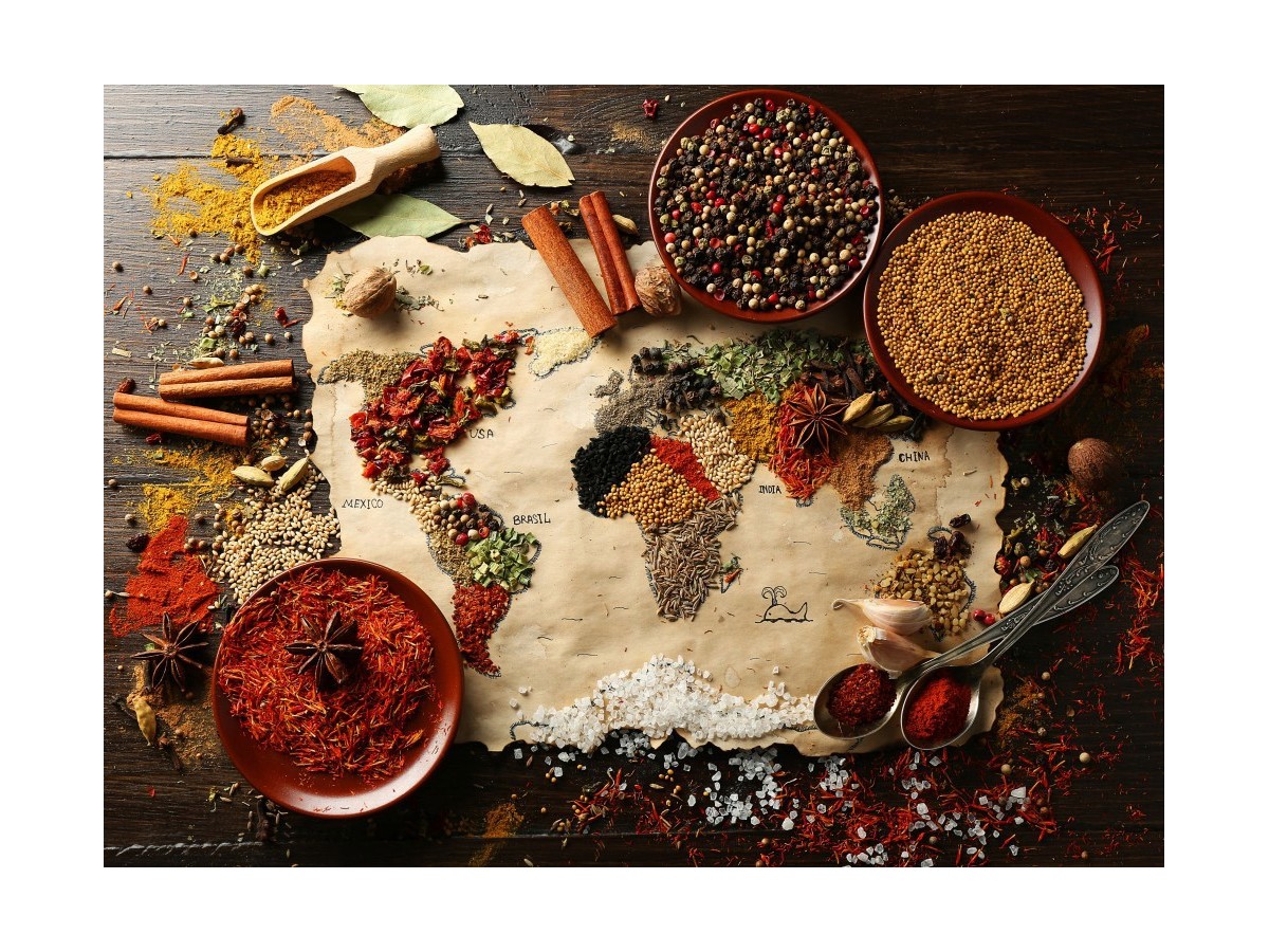 Această imagine infățișează o hartă a lumii creativă, realizată din diverse condimente și mirodenii plasate pe o foaie de hârtie veche. Continentele sunt meticulos conturate cu diverse tipuri de mirodenii, fiecare alegere reflectând o paletă cromatică vibrantă și texturi diverse. De exemplu, Europa este reprezentată prin boabe de piper și frunze de dafin, iar Africa prin boabe de muștar și chilli uscat. Alături de hartă, pe suprafață sunt răspândite diverse vase și linguri din lemn cu condimente, cum ar fi scorțișoară și safran, ce adaugă un plus de autenticitate compoziției.