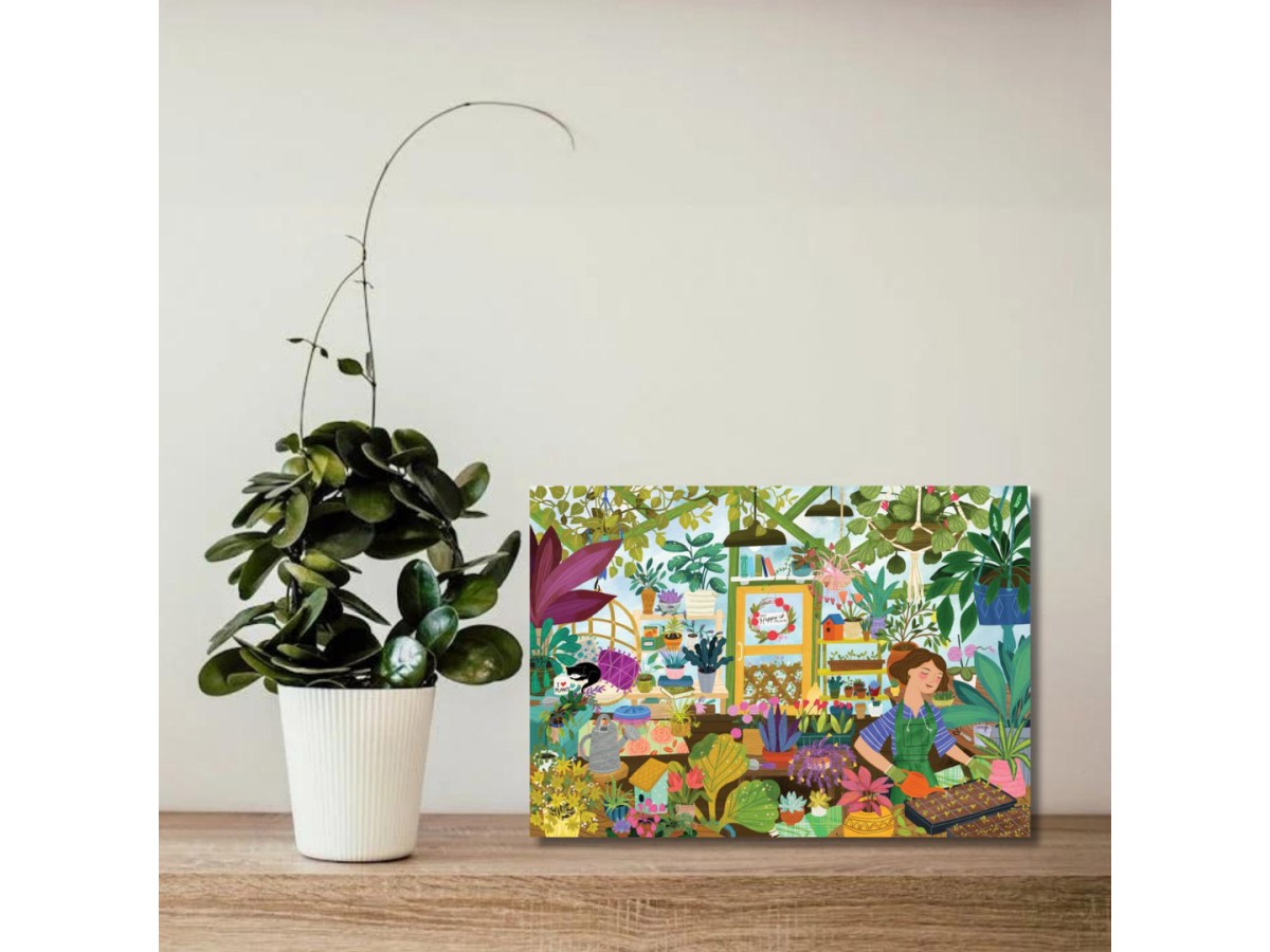 Această ilustrație vibrantă înfățișează o scenă domestică plină de viață într-o seră bogat decorată cu o varietate impresionantă de plante. O femeie pare a fi absorbită de activitatea de grădinărit, plantând îngrijit câteva răsaduri într-o tavă. Împrejurul ei, seră este plină de plante exotice, flori colorate și multiple ghivece de diverse forme și mărimi. În fundal, se observă ferestre mari prin care pătrunde lumina naturală care accentuează și mai mult culorile vibrante ale plantelor. Un pisoi negru cu pete albe se odihnește liniștit pe o poliță, adăugând o notă de calm acestei scene pline de energie. Scenele reprezentate aduc un omagiu bucuriei și pacei care pot fi găsite în îngrijirea plantelor, îmbinând armonios natura cu activitatea umană.
