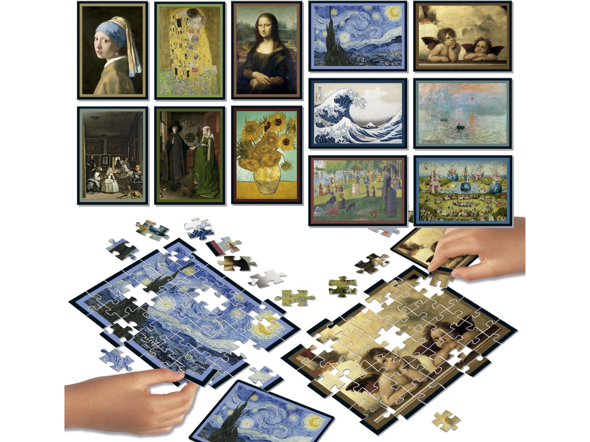 Dimensiunile puzzle-ului sunt standard, oferind o experiență captivantă de asamblare a pieselor. Cu ilustrații variate și captivante, acest puzzle educativ va stimula creativitatea și imaginația copiilor, familiarizându-i cu opere de artă celebre și diverse curente artistice.