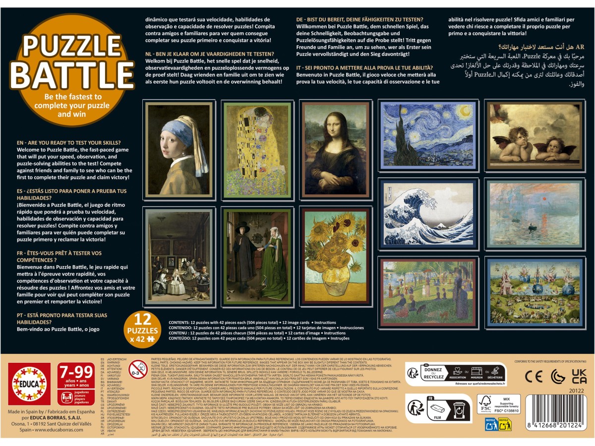 Imaginea puzzle-ului Educa - Battle Art (Educa-20122) prezintă o colecție de reprezentări ale unor opere de artă celebre, fiecare pictură fiind remarcabilă prin stilul și epoca sa. Printre capodoperele incluse se Numără 'Mona Lisa' de Leonardo da Vinci, 'Noapte înstelată' de Vincent van Gogh, 'Fata cu cercel de perlă' de Johannes Vermeer și 'The Great Wave off Kanagawa' de Hokusai, ilustrând diversitatea artistică și evoluția tehnicilor de pictură de-a lungul timpului.