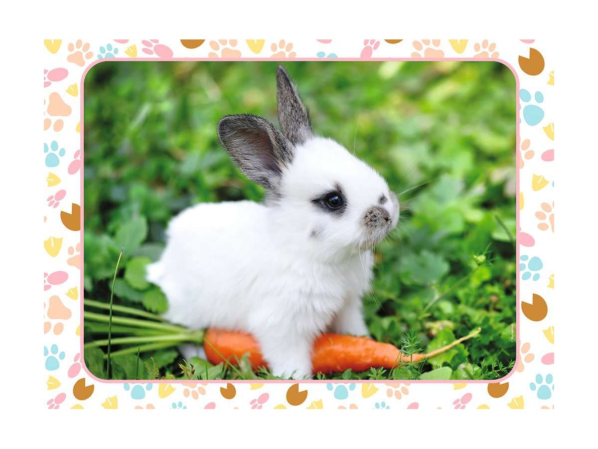 Imaginea acestui puzzle cu 45 piese Nathan - Little Bunny and His Carrot (Nathan-86166) surprinde un iepuraș alb cu pete negre, așezat pe iarbă verde într-un decor natural. Acesta se bucură de un morcov proaspăt, cu ochii mari și expresivi, evidențiind curiozitatea specifică animalului. Fundalul bogat în nuanțe de verdeață oferă un contrast plăcut cu blana și petele iepurașului, creând o scenă vibrantă și plină de viață.