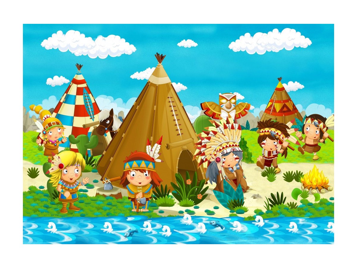 Ilustrația puzzle-ului Bluebird Puzzle cu 48 piese Small Indian Tribe surprinde o scenă vibrantă și colorată, cu influențe ale culturii indigene americane. În centrul compoziției, se observă tipi aliniate de-a lungul apei limpezi, iar copii îmbrăcați în haine tradiționale se angajează în diverse activități.