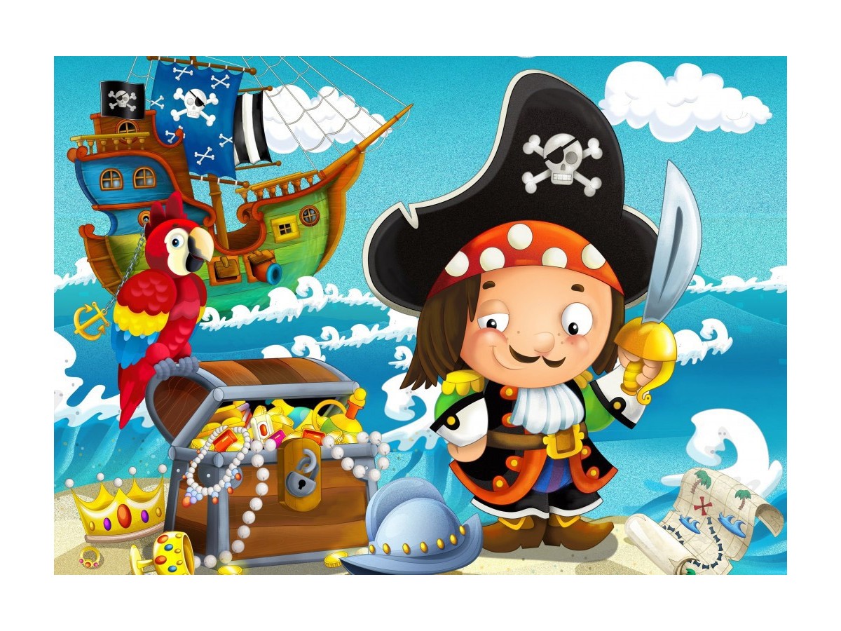 Această ilustrație colorată înfățișează o scenă marină vibrantă, dominată de un tânăr pirat vesel, înconjurat de simboluri clasice ale aventurilor pe mare. Personajul principal, un băiețel îmbrăcat în costum de pirat, cu pălărie neagră decorată cu un craniu, ține în mână o sabie argintie și un tezaur plin de monede de aur și bijuterii. În fundal, se observă un vas pirat mare, împodobit cu steaguri și vele, navigând pe ape turcoaz. Alături de pirat, un papagal colorat stă pe o ladă de comori deschisă, adăugând un element jucăuș compoziției. Scenele sunt pline de detalii care stimulează imaginația, de la harta de comori la fundal la diversele obiecte aurii și strălucitoare ce atrag privirea.