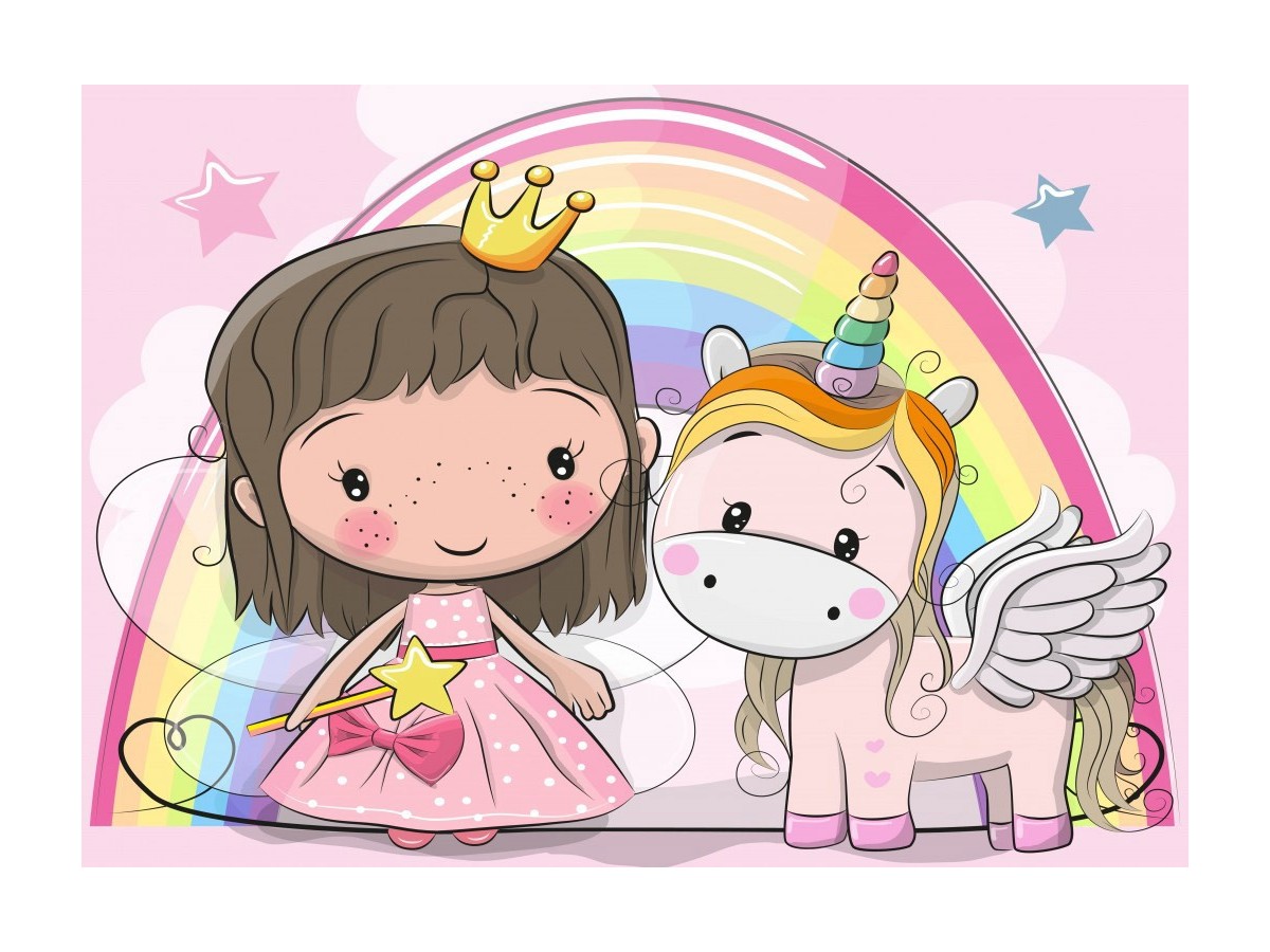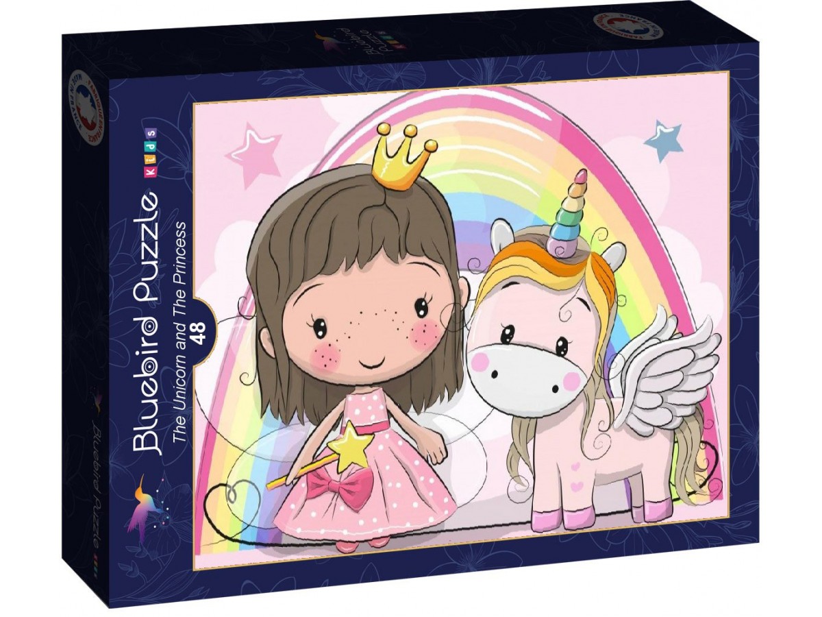 Ilustrația digitală a puzzle-ului Bluebird Puzzle cu 48 piese „The Unicorn and The Princess” te poartă într-o lume fermecată de basm, unde o prințesă tânără și un unicorn alb cu aripi se întâlnesc într-o scenă plină de magie și culoare. Prințesa, îmbrăcată într-o rochie roz și purtând o coroană aurie, ține în mână o baghetă magică, iar alături de ea stă unicornul cu coama curgătoare în nuanțe de curcubeu și un corn colorat. Fundalul este dominat de un curcubeu mare și nori pufoși, creând o atmosferă de visare și poveste.