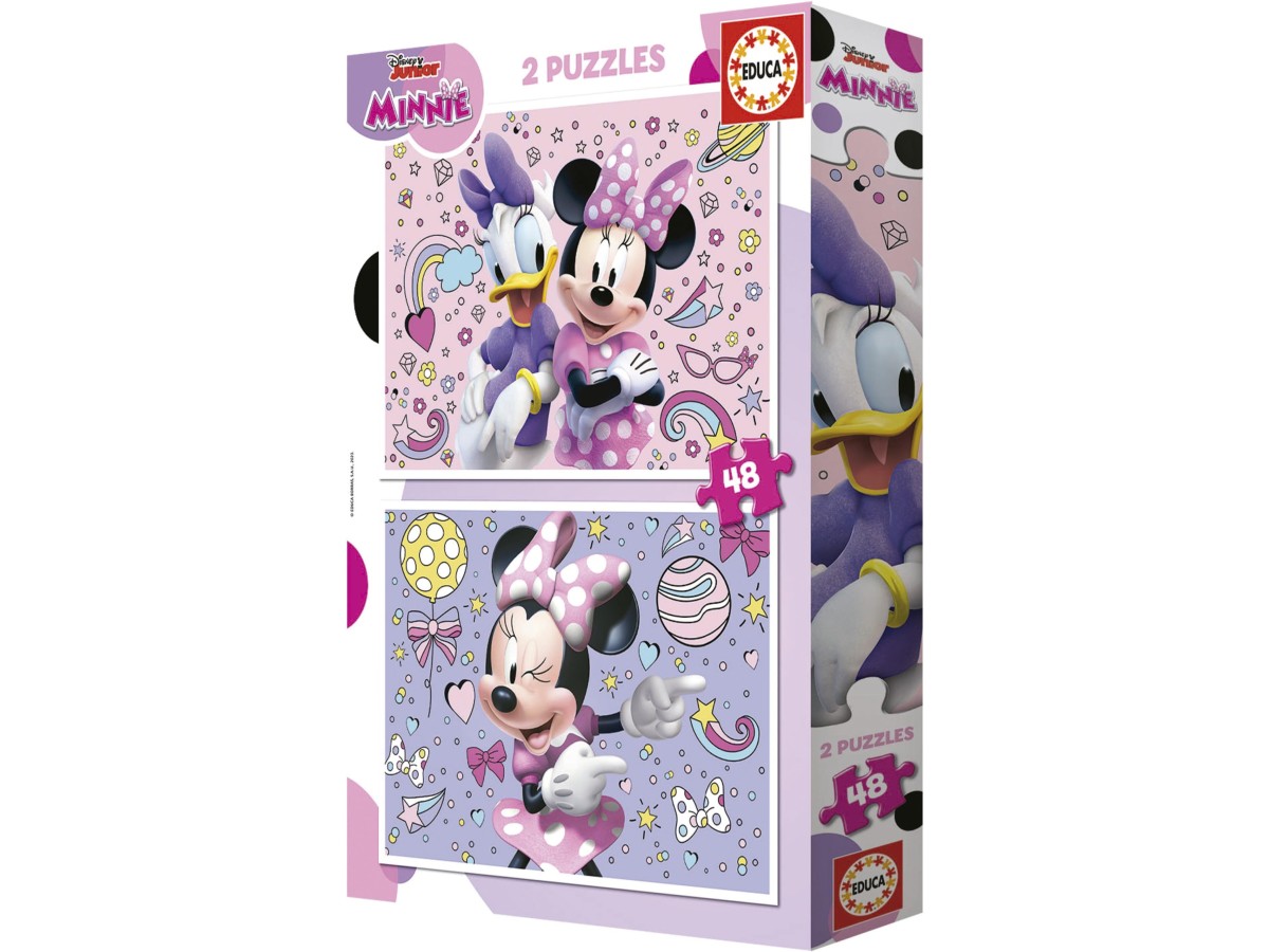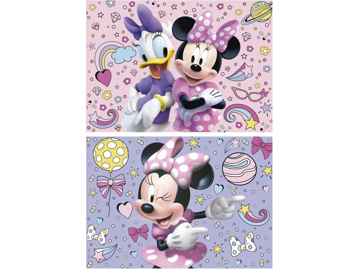 Imaginea acestui puzzle cu 48 de piese Educa - Minnie (Educa-19674) surprinde personajele Minnie Mouse și Daisy Duck, celebre din desenele animate Disney. Minnie, recunoscută pentru optimismul său și stilul distinctiv, poartă o rochie și o pălărie roz cu buline albe, în timp ce Daisy, îmbrăcată în nuanțe de violet și roz, stă alături de ea. Fundalul este decorat cu inimi și stele, adăugând un aer visător și jucăuș ilustrației. Detaliile sunt realizate într-un stil tipic ilustrațiilor animate.