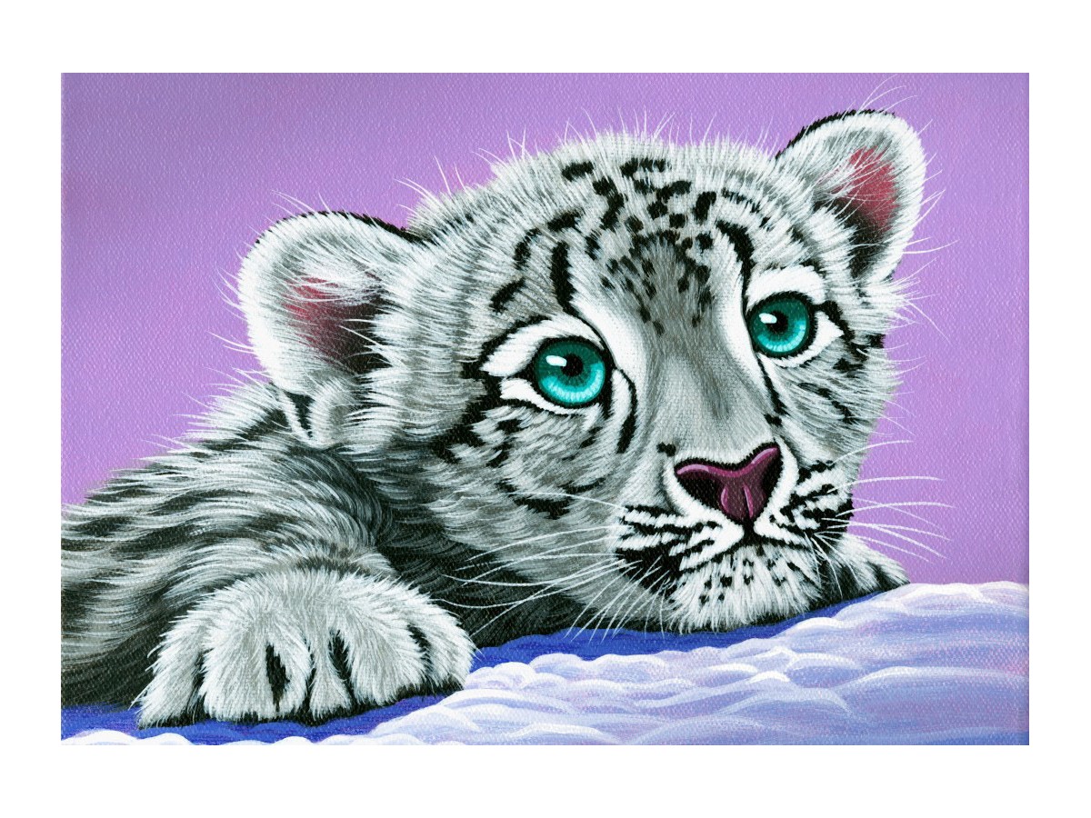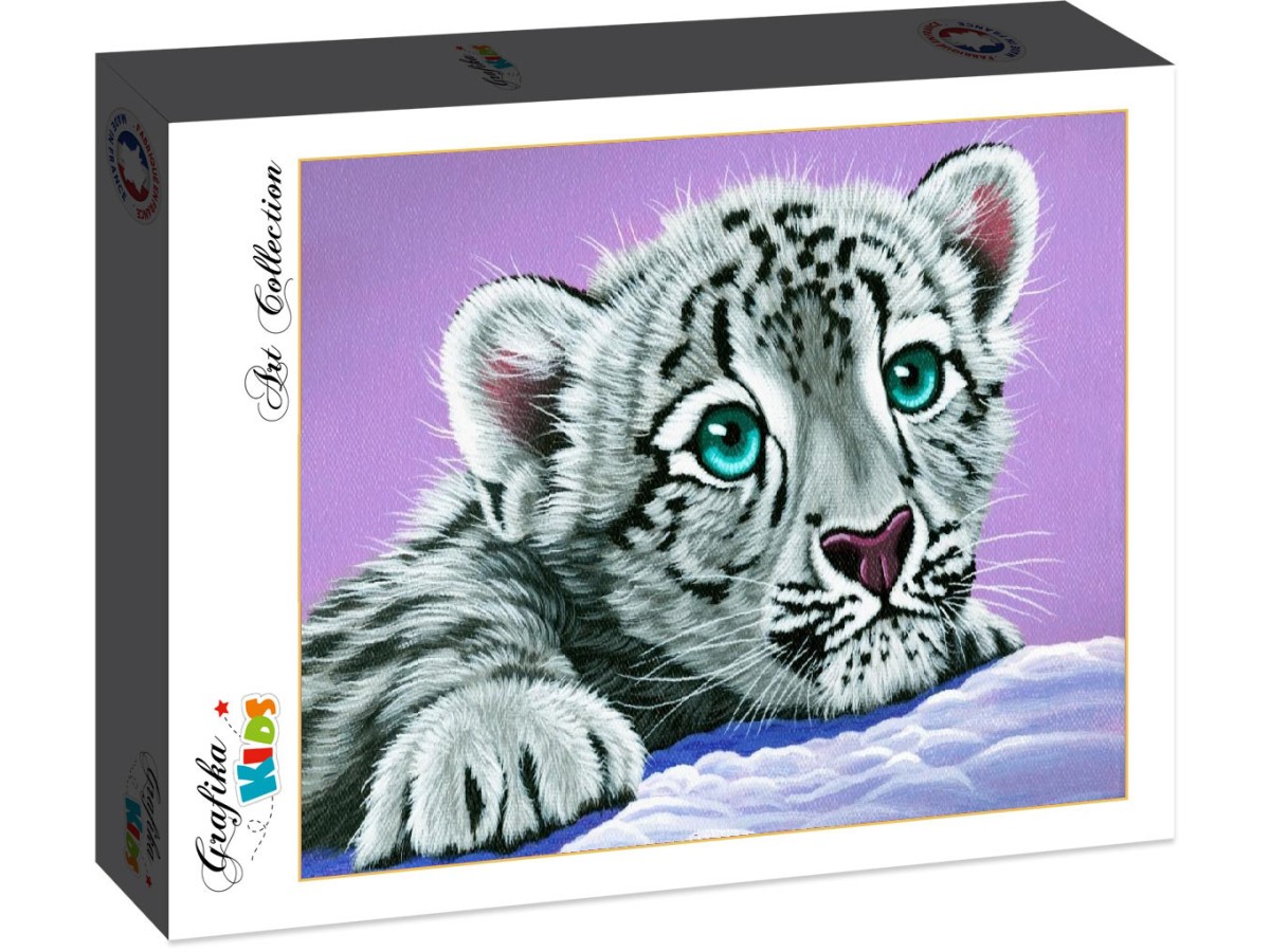 Imaginea acestui puzzle cu 48 piese de la Grafika Kids surprinde un pui de leopard zăpadă, cunoscut pentru ochii săi hipnotizanți de albaștri și blana gri cu dungi negre subtile. Animalul stă culcat, privind direct spre privitor, iar detaliile meticuloase ale blănii sunt uimitor de realiste, sugerând o lucrare de tip ilustrație digitală.
