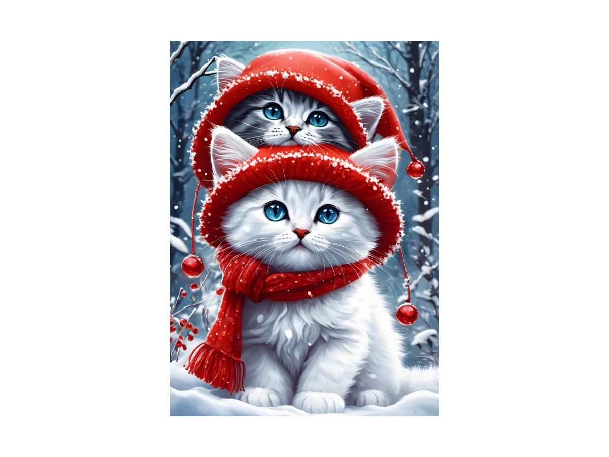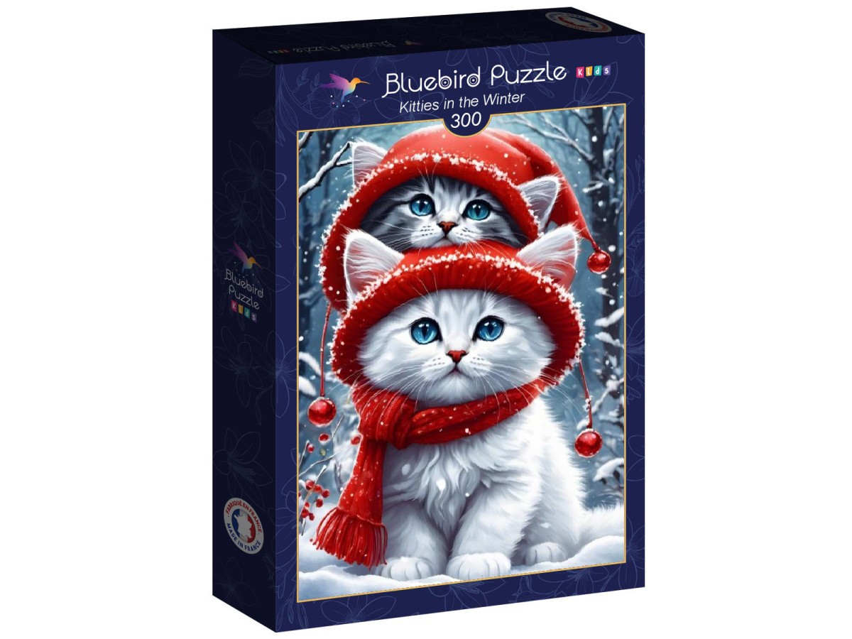 Imaginea acestui puzzle Bluebird Puzzle cu 300 de piese prezintă două pisici albe cu părul lung, având ochi mari, albaştri şi expresivi. Cele două feline sunt îmbrăcate în accesorii de iarnă, una purtând o căciulă roşie de Moş Crăciun şi un fular asortat, iar cealaltă având un fular roşu bogat. Fundalul înfăţişează o scenă de iarnă, cu copaci înzăpeziţi şi fulgi de zăpadă căzând uşor, creând o atmosferă calmă şi festivă, specifică sezonului rece. Paleta de culori se compune din albastru intens şi accente roşii, sugerând sărbătorile de iarnă.