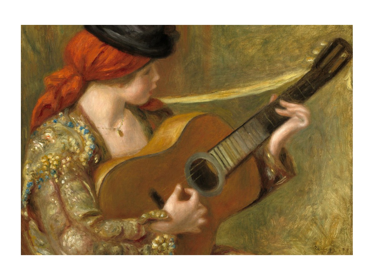 Lucrarea intitulată 'Young Spanish Woman with a Guitar' a fost pictată în 1898 de Auguste Renoir. În centrul operei se află figura unei tinere femei spaniole, evidențiată prin părul său roșu aprins și o bandană portocalie strălucitoare. Ea este îmbrăcată într-o rochie tradițională bogat decorată, predominant în tonuri de aur și albastru, care reflectă lumina într-un mod care amplifică textura și strălucirea acesteia. Tânăra este profund implicată în actul de a cânta la chitară, instrumentul fiind ținut cu mâna stângă la nivelul gâtului și cu mâna dreaptă plasată pe corzile aproape de corpul chitarei.