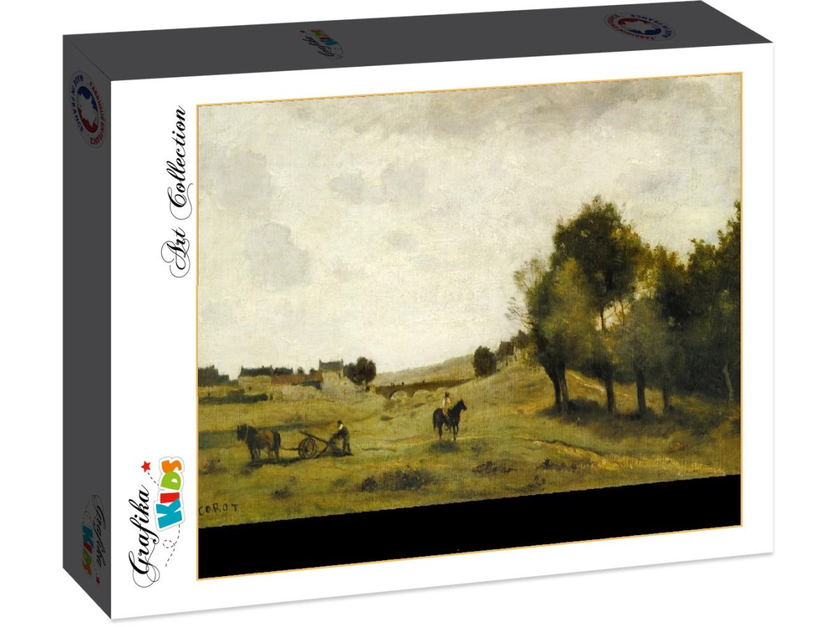 Puzzle-ul cu 300 de piese Grafika Kids - Jean-Baptiste Camille Corot: View near Epernon, 1850-1860 (Grafika-F-32159) redă o scenă rurală idilică din secolul al XIX-lea, semnată de renumitul artist francez Jean-Baptiste Camille Corot. În prim-plan, un bărbat călărește un cal, în timp ce în partea stângă, un alt bărbat conduce o căruță trasă de boi. Peisajul este dominat de câmpii întinse, copaci rari și un cer acoperit de nori subtili, sugerând o atmosferă calmă și pastorală. Tonurile pământii și verzi predomina, creând o imagine plină de farmec.