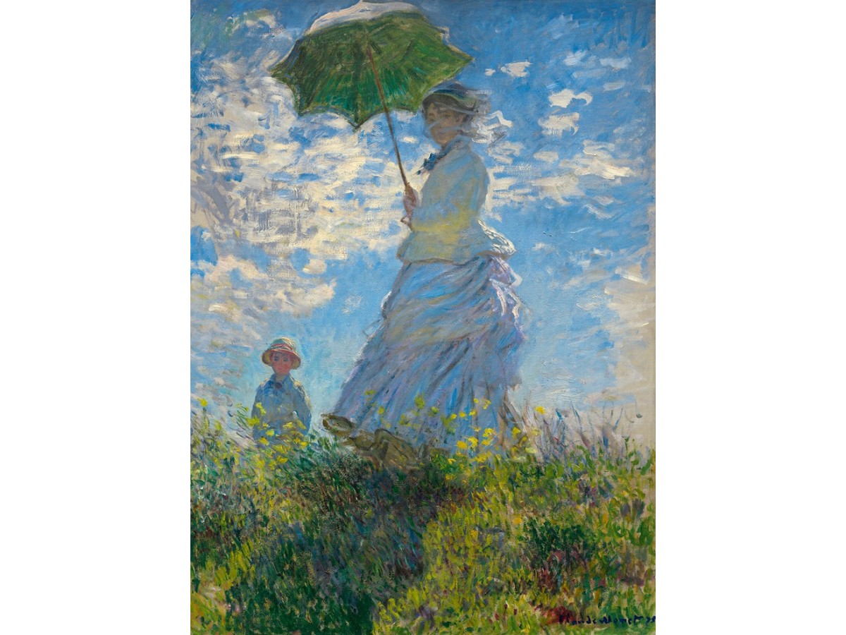 Această pictură, semnată de Claude Monet, surprinde o femeie și un copil pe un câmp în timpul unei zile însorite. Femeia, plasată în prim-plan, este îmbrăcată într-o rochie lungă de culoare deschisă și ține deasupra capului o umbrelă verde care o protejează de soare. Poziționată din profil, femeia pare să se plimbe, iar expresia ei este calmă și contemplativă. În plan secundar, un copil mai mic, îmbrăcat în albastru, o urmărește de la distanță. Scena este ambientată într-un câmp plin de ierburi înalte și flori sălbatice, sub un cer vast, parțial noros. Lumina soarelui, filtrată prin umbrelă și nori, creează un joc de lumină și umbră pe figurile personajelor și peisaj.