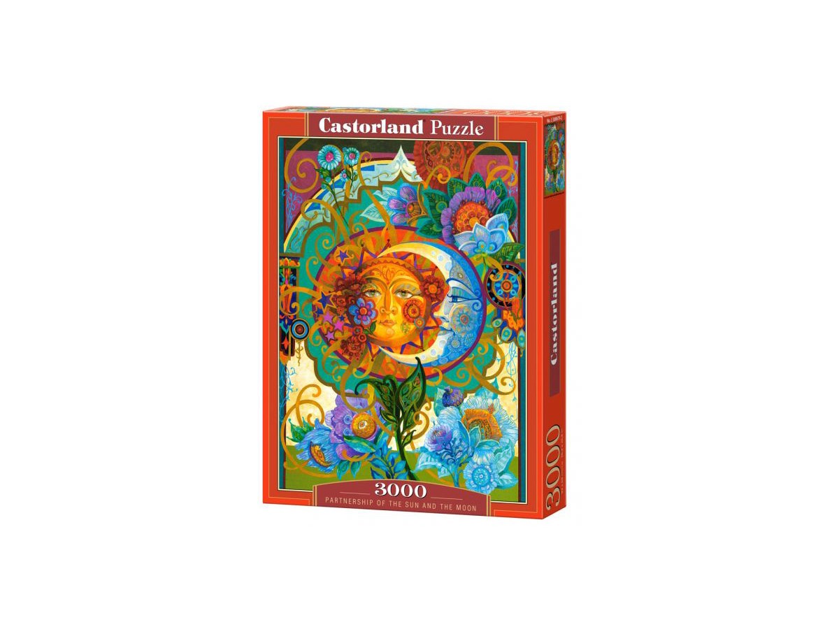 Imaginea prezentată pe puzzle-ul Castorland cu 3000 piese, intitulat Partnership of the Sun and the Moon, surprinde o ilustrație vibrantă ce amintește de arta nouă, cu linii fluide și detalii ornamentale complexe. Aceasta redă o conexiune simbolică între un soare și o lună personificate, înconjurate de flori colorate și elemente naturale, precum minaretele subtile din fundal, adăugând un aer de mister și exotism.