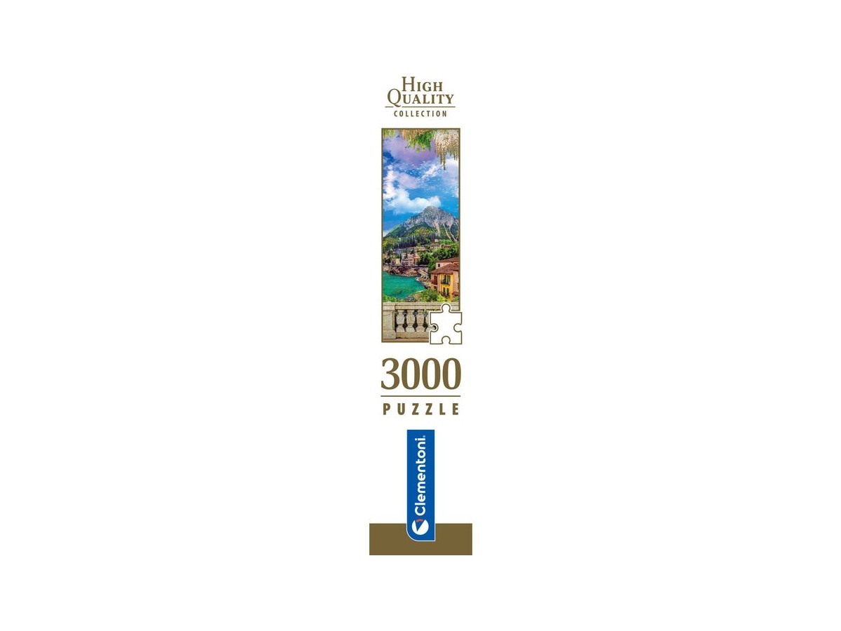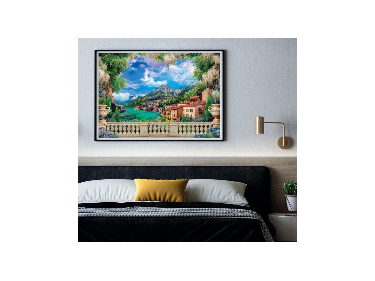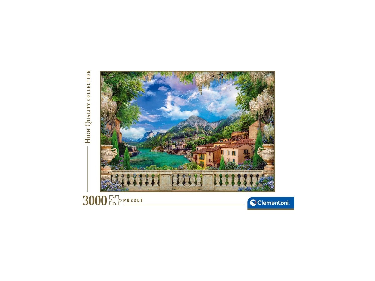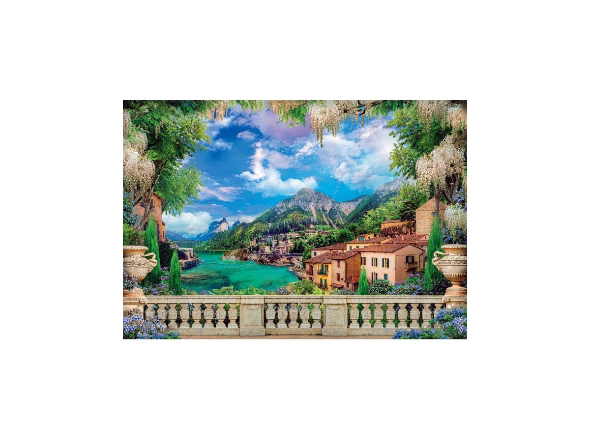 Imaginea puzzle-ului Lush Terrace On Lake de la Clementoni surprinde o panoramă pitorească, inspirată dintr-un peisaj vibrant, dispusă ca o pictură. Vederea este dominată de un lac de un albastru intens, flancat de o arhitectură mediteraneană cu nuanțe calde de ocru și teracotă. În fundal, munți înalți, acoperiți cu vegetație, adaugă o senzație de grandiozitate și măreție peisajului. Un balcon ornamentat cu balustrade din piatră, vegetație luxuriantă și flori agățate se deschide spre această scenă naturală, oferind perspectiva unui privitor care se odihnește și admira peisajul.