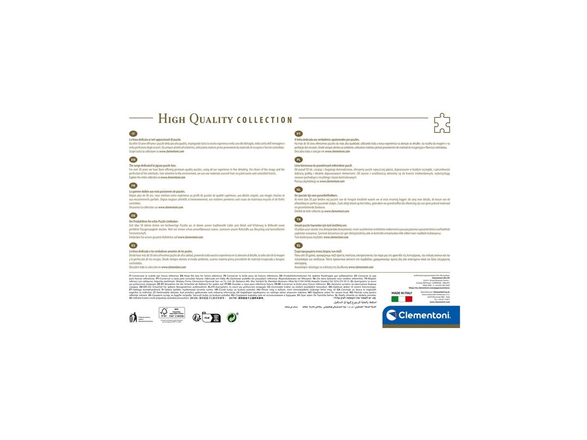 Clementoni a creat acest puzzle format din 3000 de piese, oferind o provocare captivantă pentru cei pasionați de puzzle-uri. Cu dimensiunile de 118,4 x 84,5 cm, acest puzzle aduce la viață o ilustrație detaliată și colorată, potrivit pentru cei de 10+ ani. Brandul Clementoni se remarcă prin calitatea materialelor folosite și prin atenția la detalii, garantând o experiență de asamblare plăcută și satisfăcătoare.