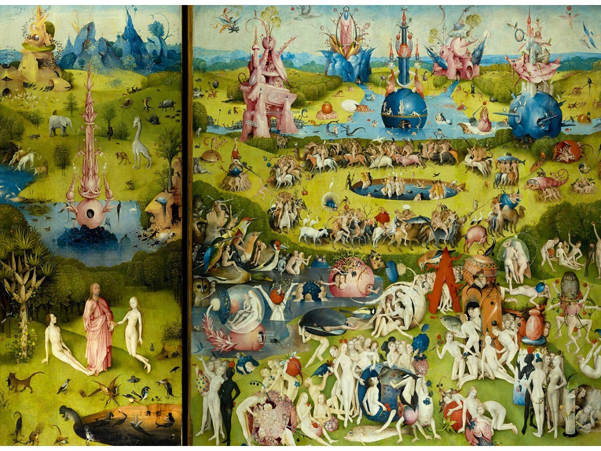 Această pictură, cunoscută sub numele de 'Grădina Plăcerilor Pământești', a fost realizată de artistul Hieronymus Bosch. Opera este un triptică impresionantă și complexă, care explorează teme ale ispitei și păcatului în trei panouri vibrante. Panoul din stânga reprezintă Grădina Edenului cu scene idilice și figuri religioase, precum Adam și Eva. Panoul central este plin de imagini ale plăcerii umane, cu Număroase figuri umane și animale în diverse activități ludice și supranaturale. Panoul din dreapta ilustrează pedepse infernale și monștri fantastici, oferind o viziune grotescă asupra consecințelor păcatului. Fiecare panou este bogat în detalii și simboluri care provoacă la interpretări multiple, stilul fiind clar renascentist.