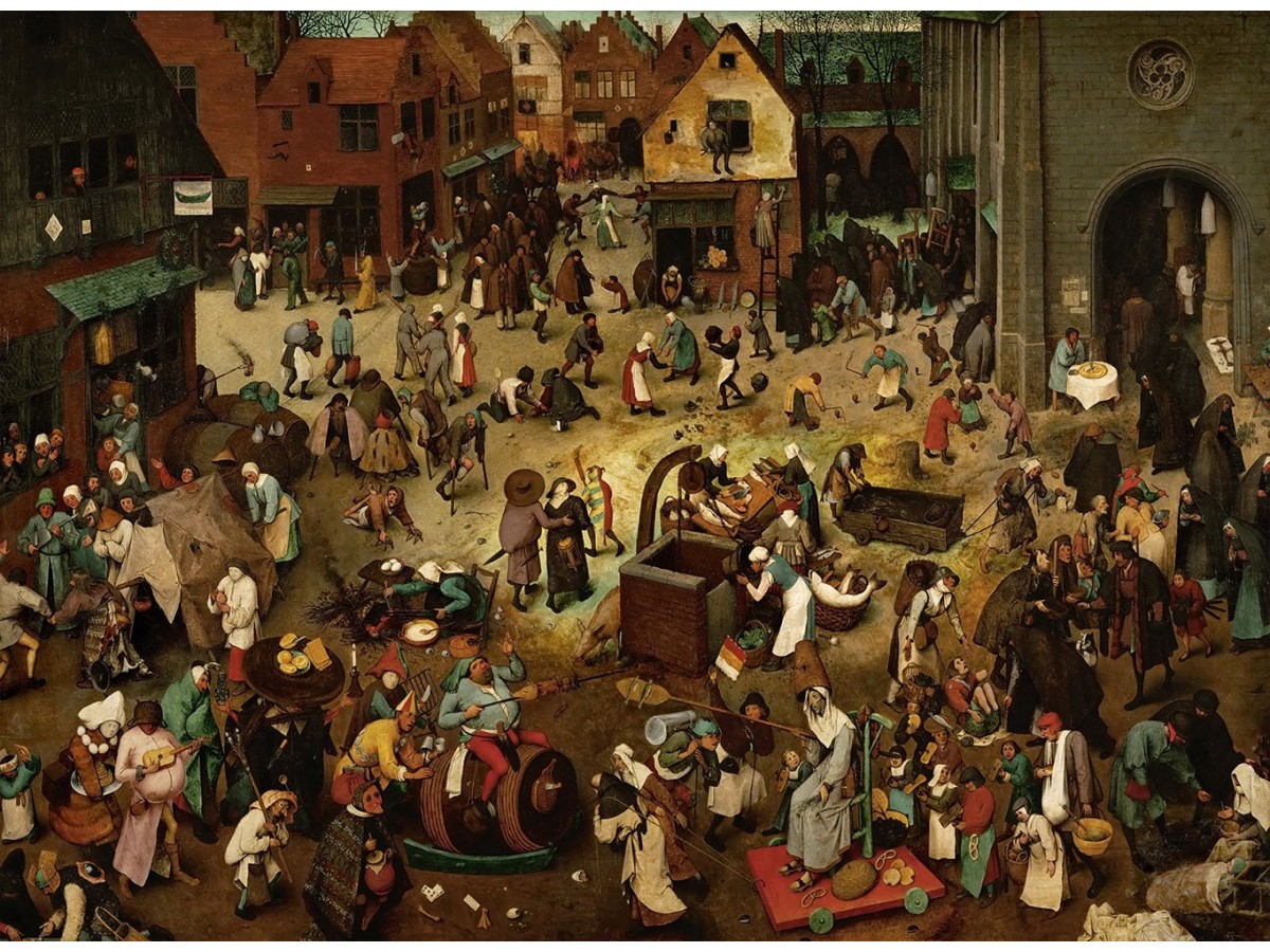 Această pictură intitulată 'Lupta dintre Carnaval și Post' a fost creată de Pieter Bruegel în anul 1559. Operă descrie o scenă animată într-un oraș medieval unde două grupuri se confruntă. Pe partea stângă, Carnavalul este reprezentat printr-un personaj îmbrăcat extravagant, pe un butoi, purtând o pălărie de bucătar și mânuind o lingură uriașă, simbolizând excesul și desfătul. Pe partea dreaptă, Postul este ilustrat printr-o femeie slabă, pe o căruță tristă, decorată auster, accentuând privațiunile asociate cu perioada postului. Piața orașului este plină de oameni care participă la diverse activități tipice epocii, precum târgul de mâncare, jocuri și dansuri. Pe lângă acestea, apare și o gamă variată de expresii și stări umane, de la veselie la sobrietate, descrise în stilul realist. Pictura, prin detalii minuțioase și utilizarea perspectivelor, oferă un comentariu vibrant și colorat asupra tradițiilor și obiceiurilor sociale din secolul XVI.