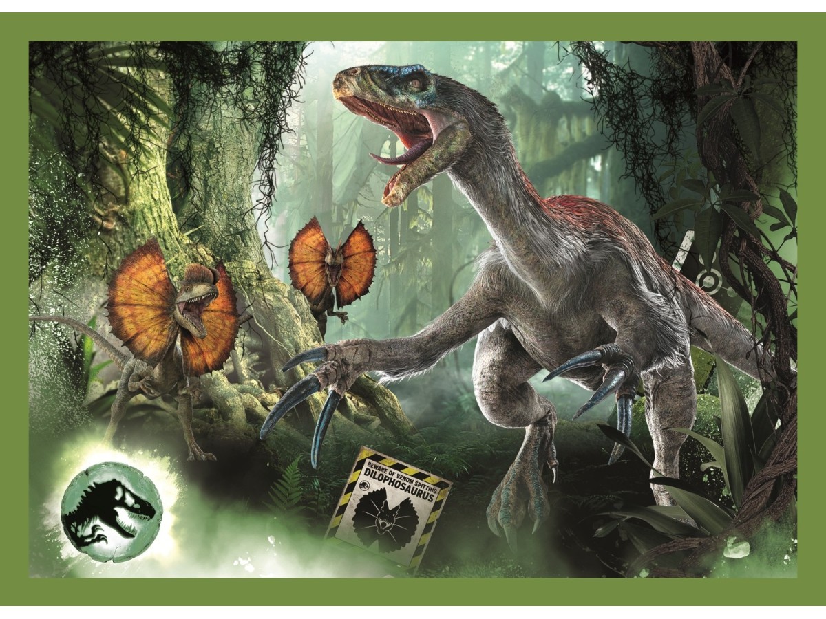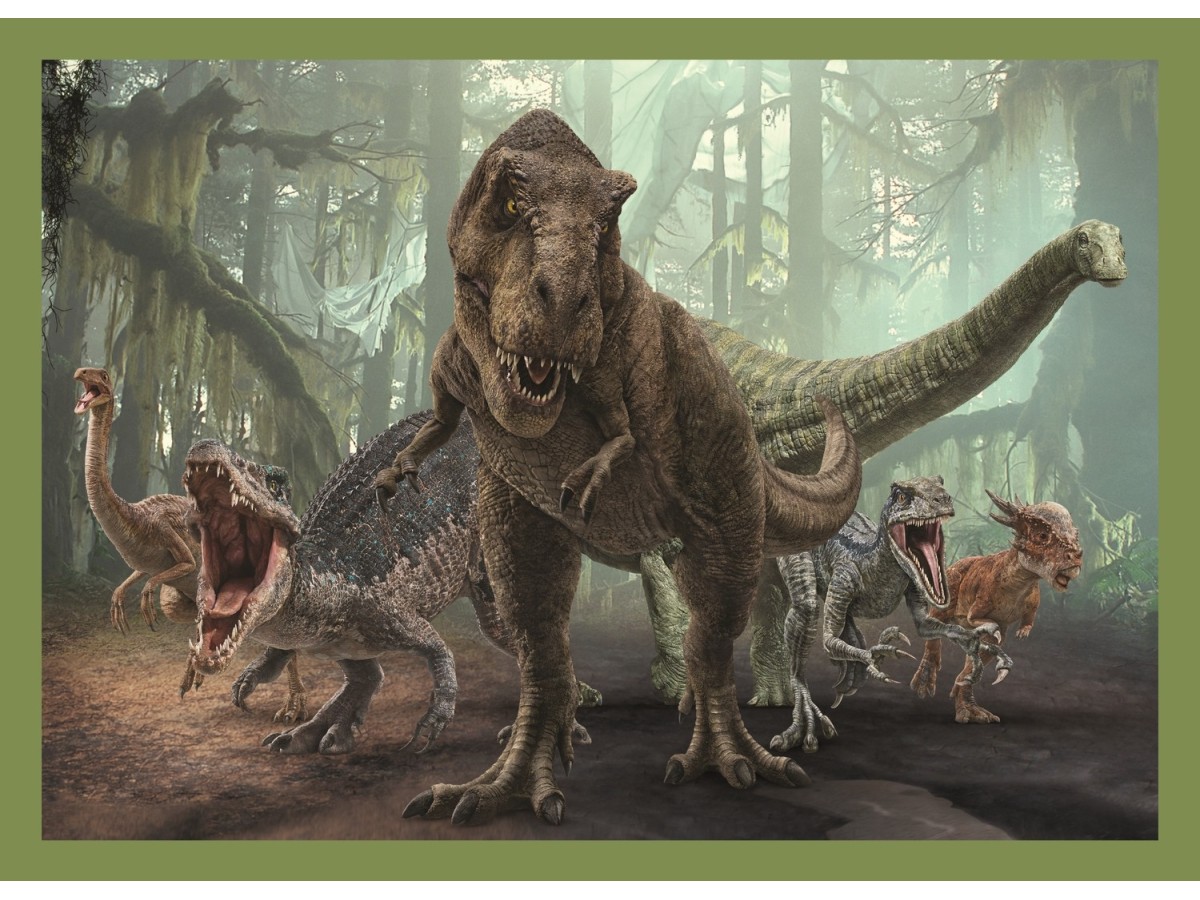 Imaginea captivantă a puzzle-ului Trefl cu 35 de piese Threatening Dinosaurs surprinde un moment dintr-o lume antică, dominată de dinozauri. În prim-plan, un Tyrannosaurus rex stă impunător pe două picioare, cu gura larg deschisă într-un răcnet amenințător. În spatele său, mai mulți dinozauri de aceeași specie par să fugă sau să-l urmărească, într-o pădure densă, plină de mușchi și arbori înalți, creând o atmosferă misterioasă și primitivă. Lumina difuză ce pătrunde printre copaci accentuează senzația de natură nețămuită și periculoasă.