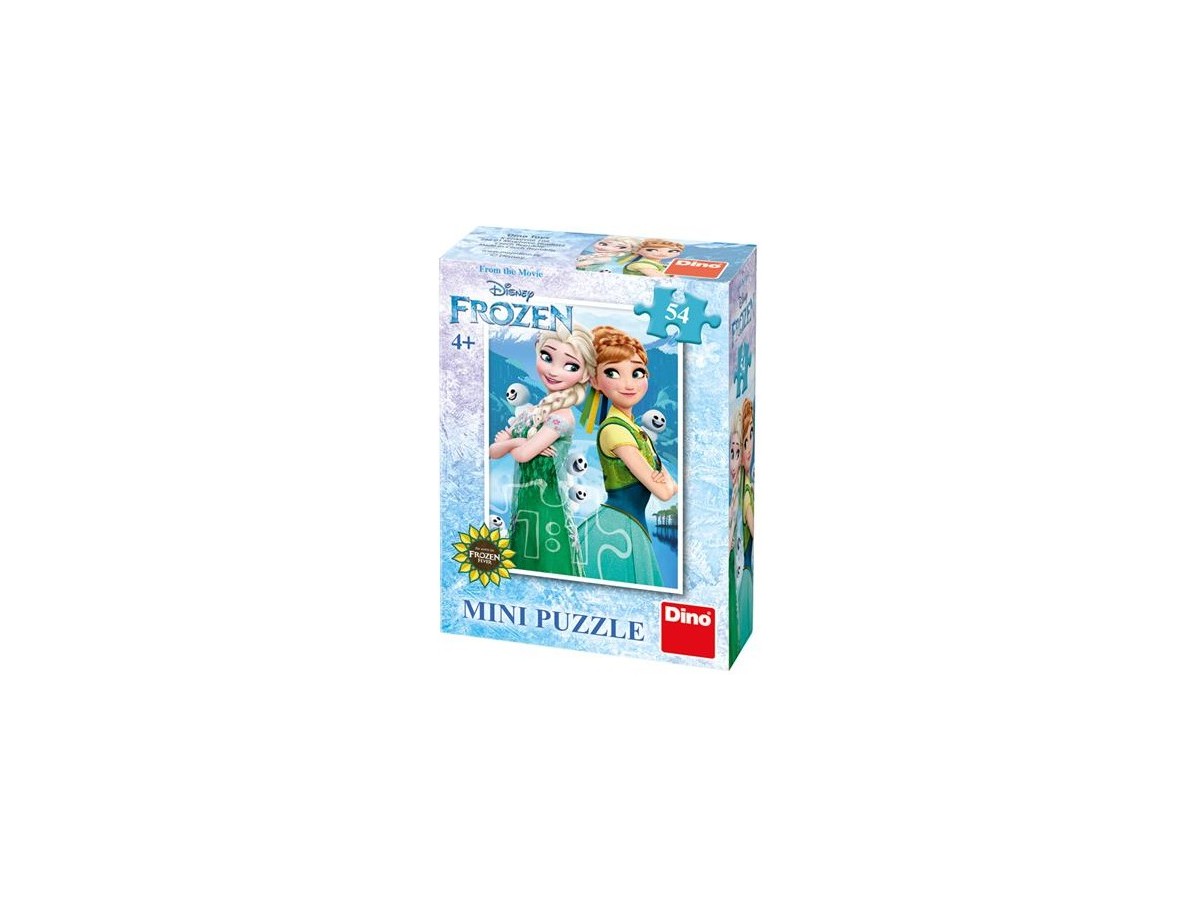 Imaginea puzzle-ului cu 54 piese Dino - Mini-puzzle Frozen este inspirată din filmul de animație Frozen de la Disney. Ilustrația colorată prezintă personajele principale, Elsa și Anna, alături de Olaf și Sven, într-un peisaj înghețat din regatul Arendelle.