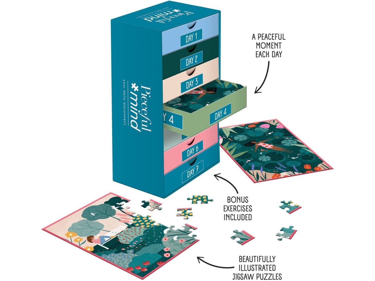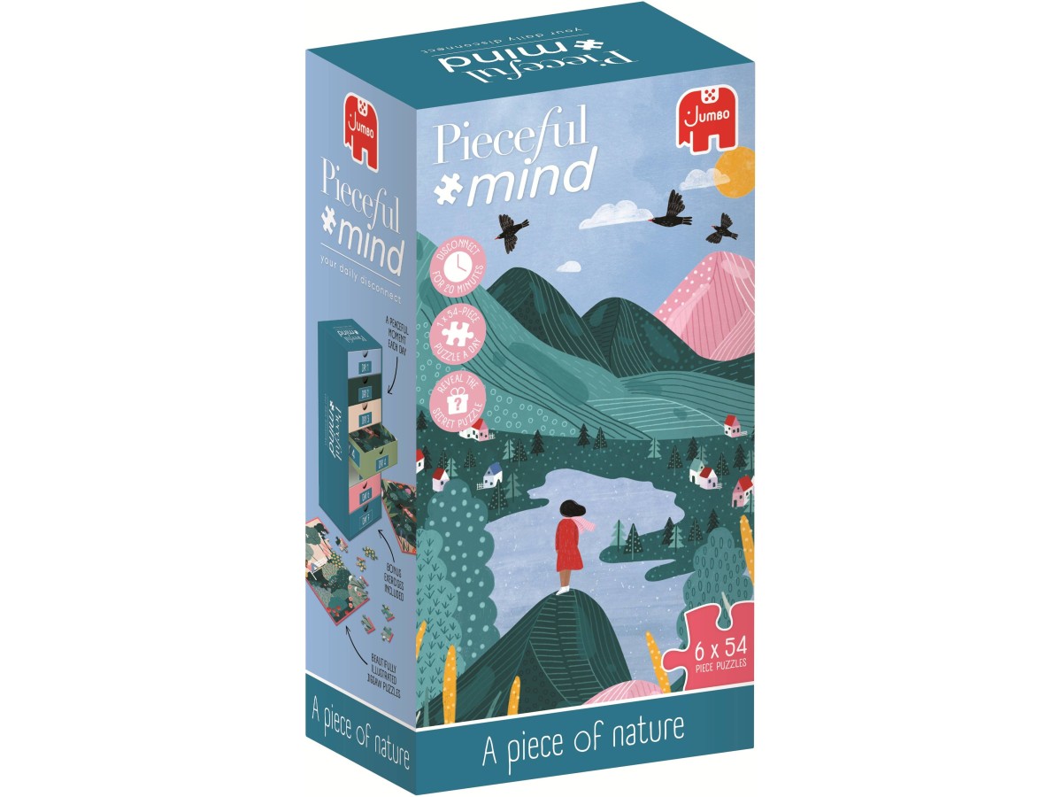 Imaginea acestui puzzle de 54 de piese de la Jumbo, intitulat Pieceful Mind - A Piece of Nature, surprinde un peisaj natural idilic, în stilul unei ilustrații. Un personaj solitar stă pe o stâncă, privind spre un peisaj montan cu munti netezi și înalți în fundal, acoperiți parțial de zăpadă. Cerul este împodobit cu păsări zburând și nori dispersați, iar un lac calm se întinde în centrul imaginii, înconjurat de arbori stilizați.