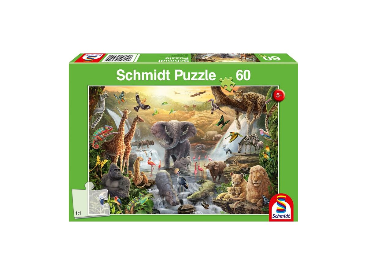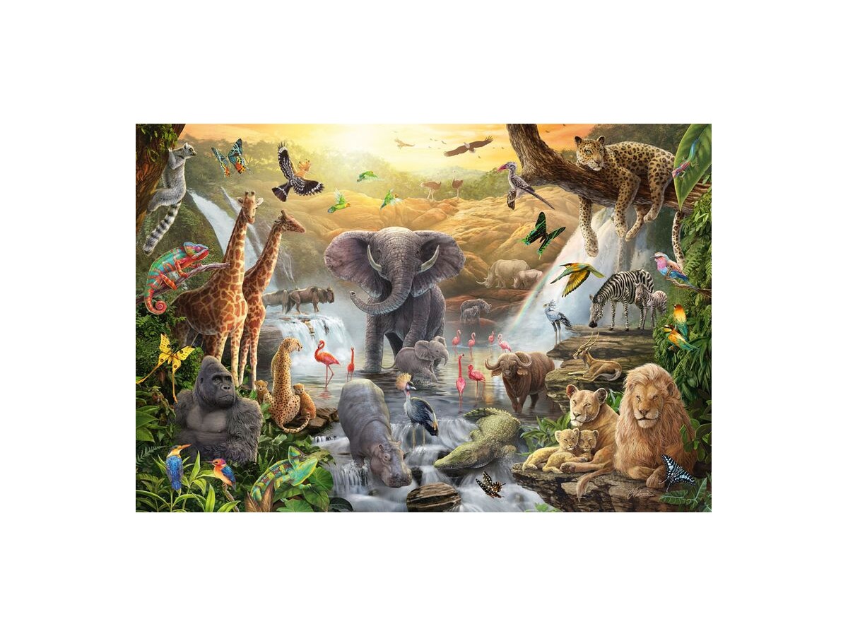 Ilustrația vibrantă a puzzle-ului cu 60 piese Schmidt - C. Edwards: Animals in Africa (Schmidt-56454) captează o scenă animată din savana africană, unde o varietate impresionantă de animale sălbatice coexistă într-un cadru naturalist. În centrul compoziției, un elefant masiv își arată impunătoarea prezență, stropind apă în jur cu trompa sa, în timp ce o familie de girafe își întinde gratioasele gâturi pentru a mânca frunzele înalte ale copacilor. În partea dreaptă, un leu mândru stă așezat pe o stâncă, observând împrejurimile, iar lângă el, un pui de leu se joacă nestingherit. Peisajul este învăluit de o cascadă spectaculoasă care completează această scenă idilică plină de viață și culoare.
