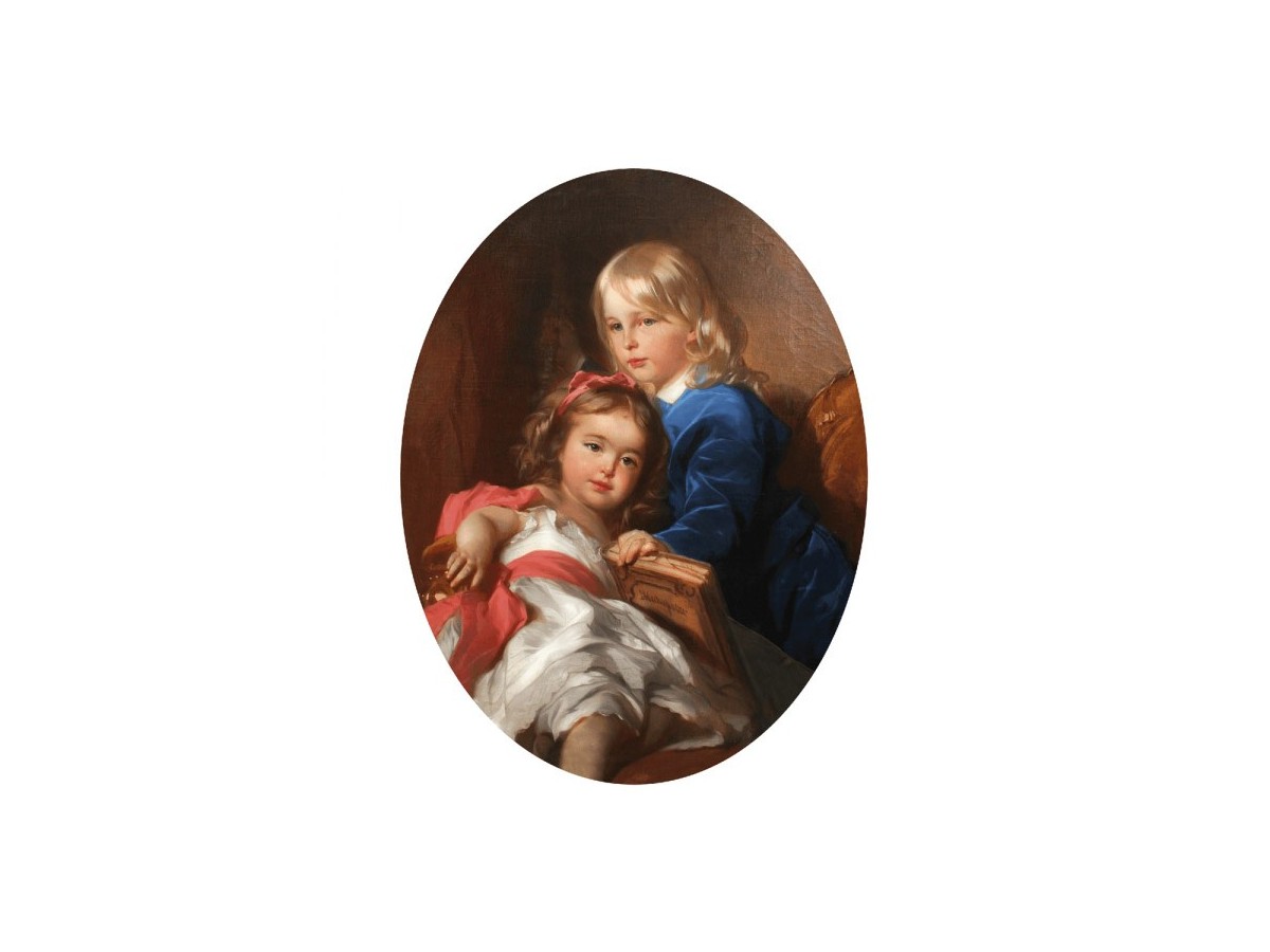 Această pictură intitulată ‘Portrait of Children’ prezintă două figuri umane juvenile, un băiat și o fată, portretizate în stil realist, cu o iluminare accentuată care emană căldură și afecțiune. Fetița, îmbrăcată într-o rochie roșie cu accente albe, se sprijină grațios de băiatul alături. Băiatul, cu o îmbrăcăminte în nuanțe de albastru, privește protector spre privitor, conferind o notă de seriozitate compoziției. Amândoi copiii sunt înnobilati prin expresiile lor mature și privirea directă, aspecte ce sugerează o conexiune frățească puternică.