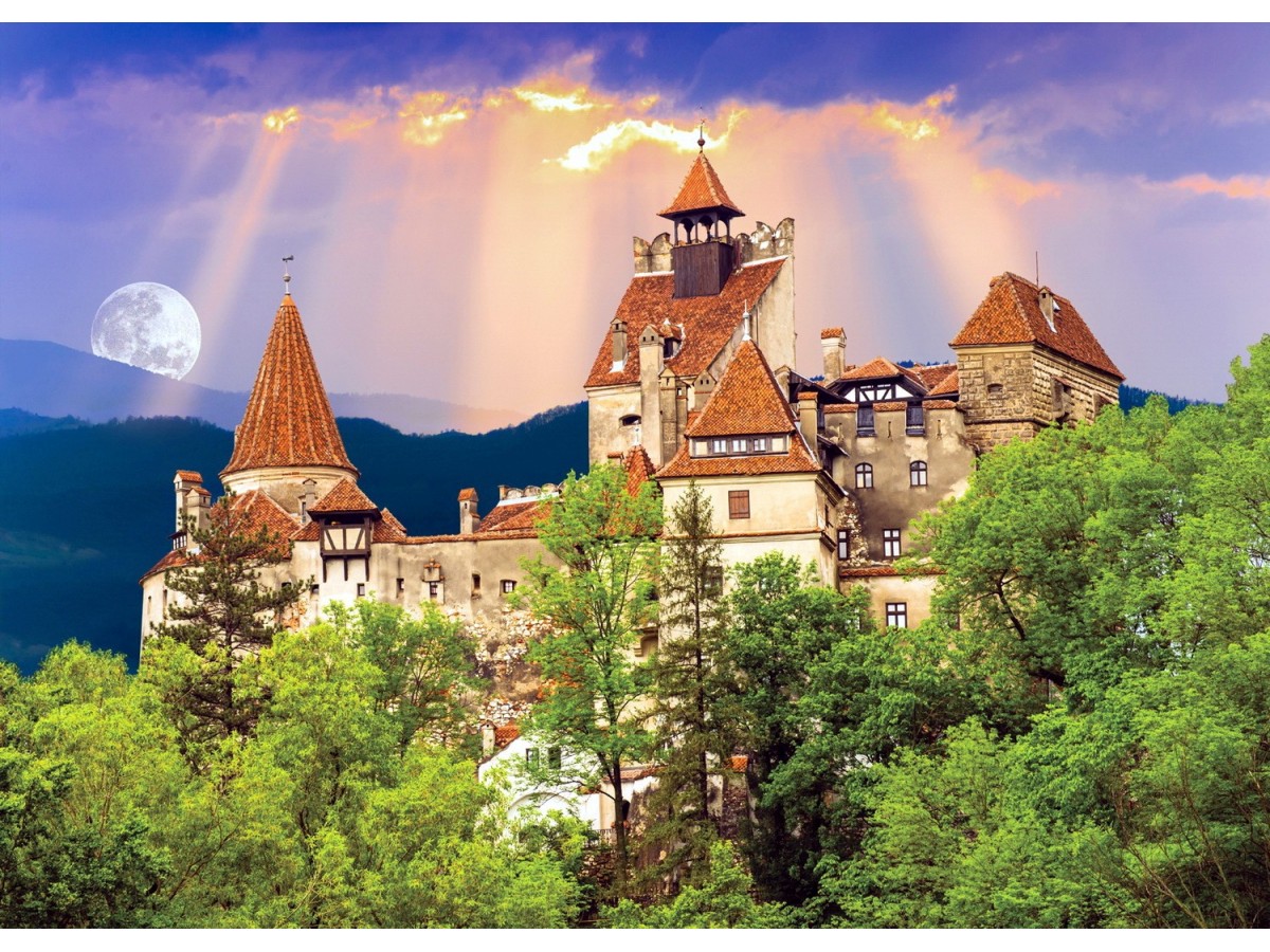 Ilustrația digitală a castelului Bran, cu luna împlinită care apare subtil în fundal, adaugă un efect vizual deosebit și un contrast dramatic cu cerul luminat de apusul de soare. Fiecare piesă a acestui puzzle este atent concepută pentru a se potrivi perfect în imaginea finală, oferind o satisfacție deplină în timpul asamblării.