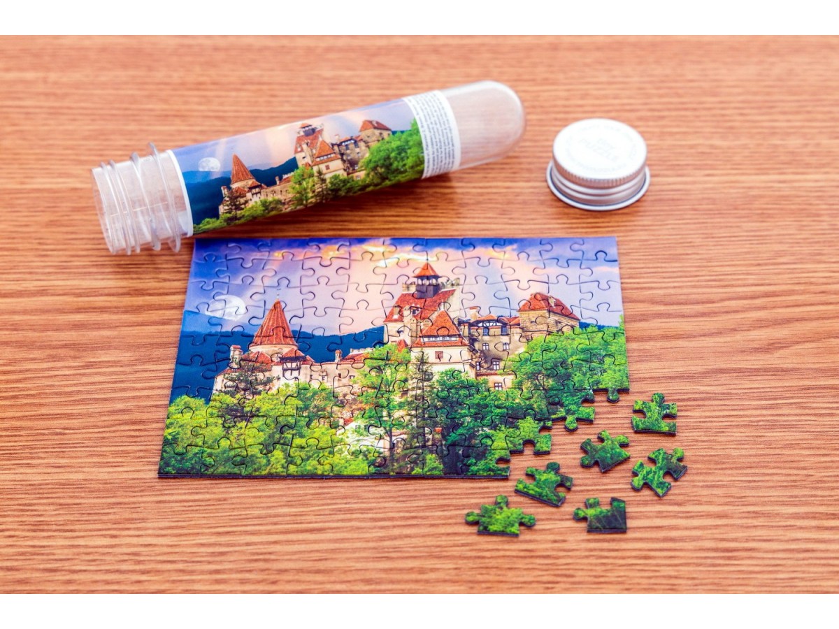 Imaginea prezentată pe puzzle-ul Castelul Bran, cu 99 de piese, surprinde un peisaj pitoresc cu un castel așezat pe un deal înconjurat de o pădure densă, sub un cer spectaculos iluminat de razele soarelui la apus. Arhitectura impunătoare a castelului, cu turnuri conice acoperite cu șisturi roșii și ferestre arcuite, emană o senzație de vechime și mister.