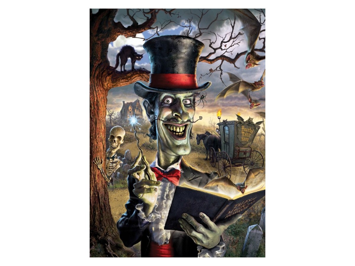 Ilustrația puzzle-ului prezintă un personaj masculin, cu un zâmbet larg și sinistru, purtând un costum elegant și o pălărie neagră, stilată din secolul 19, evident focalizat într-un peisaj nocturn lugubru și tenebros. Scena este delimitată de prezența unui cimitir vechi, cu morminte și schelete parțial vizibile, transmitând un sentiment macabru și misterios. Fundalul este populat de copaci deșcheiați cu crengi contorsionate, accentuând atmosfera de poveste înfricoșătoare, iar cerul este acoperit parțial de norii întunecați de seară. Elementele fantastice sunt evidente, cum ar fi corbi și siluete fantomatice ce flutură în jur, compunând o scenă dramatică, propice poveștilor cu vampiri sau alte entități supranaturale.