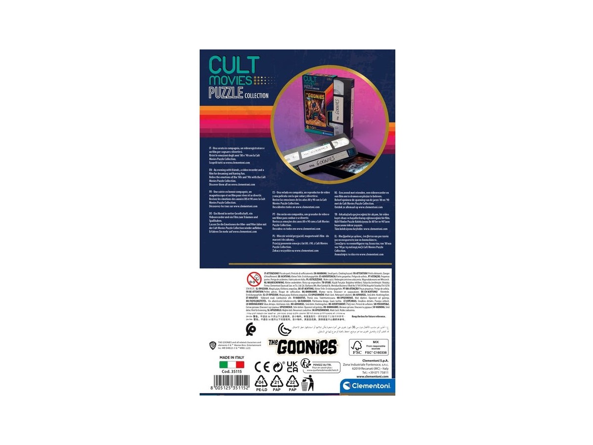 Acest puzzle pentru adulți de la Clementoni are dimensiunile de 49 x 36 cm și este ideal pentru cei care sunt pasionați de povestea captivantă a filmului 'The Goonies'. Brandul Clementoni este cunoscut pentru calitatea și detaliile fine ale puzzle-urilor sale, oferind o experiență de asamblare plăcută și satisfăcătoare.