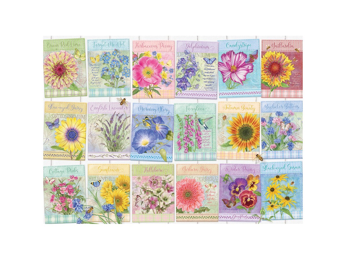 Imaginea puzzle-ului Cobble Hill 500 piese - Jane Shasky: Seed Packets prezintă o colecție de ilustrații colorate ce reprezintă diferite pachete de semințe pentru flori, fiecare etichetat cu numele speciei respective. Fiecare pachet este decorat cu o ilustrație vibrantă a florii menționate, acompaniată de text caligrafic și fundaluri diverse, fiecare sugerând textura unui material textil, precum lână sau in. Speciile de flori reprezentate variază de la clasicii maci și floarea-soarelui până la specii mai puțin comune, precum echinacea sau irisul. Ilustrațiile sunt detaliate, arătând atât florile cât și frunzele, iar culorile sunt vii, cu tonuri predominante de galben, roz, mov și albastru.