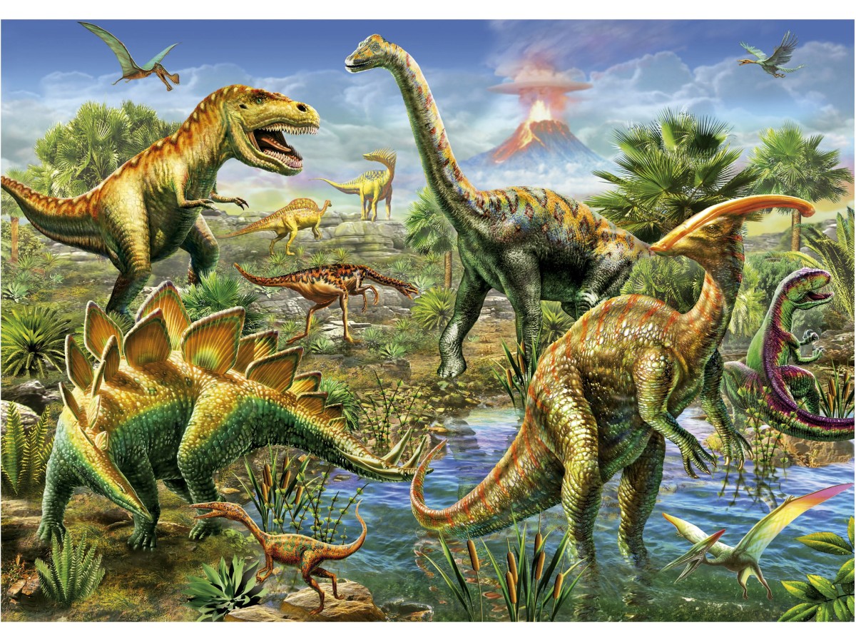 Imaginea prezentată este o ilustrație digitală în detalii vii care redă o scenă animată din era preistorică, în care dinozaurii domină peisajul. În prim-plan, un grup de dinozauri erbivori cu pielea în nuanțe de verde și maro se odihnește lângă un lac, în timp ce în fundal, câțiva dinozauri carnivori de dimensiuni impresionante se angajează în diferite activități, unul dintre ei chiar stând în poziție de atac. Cerul este intens colorat, indicând o atmosferă tropicală, cu vulcani activi care erupe în departare, completând această scenă din trecutul îndepărtat al Pământului.