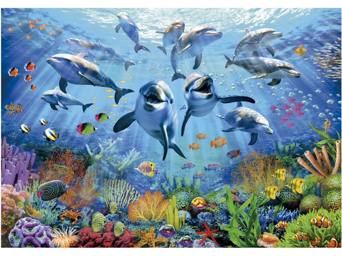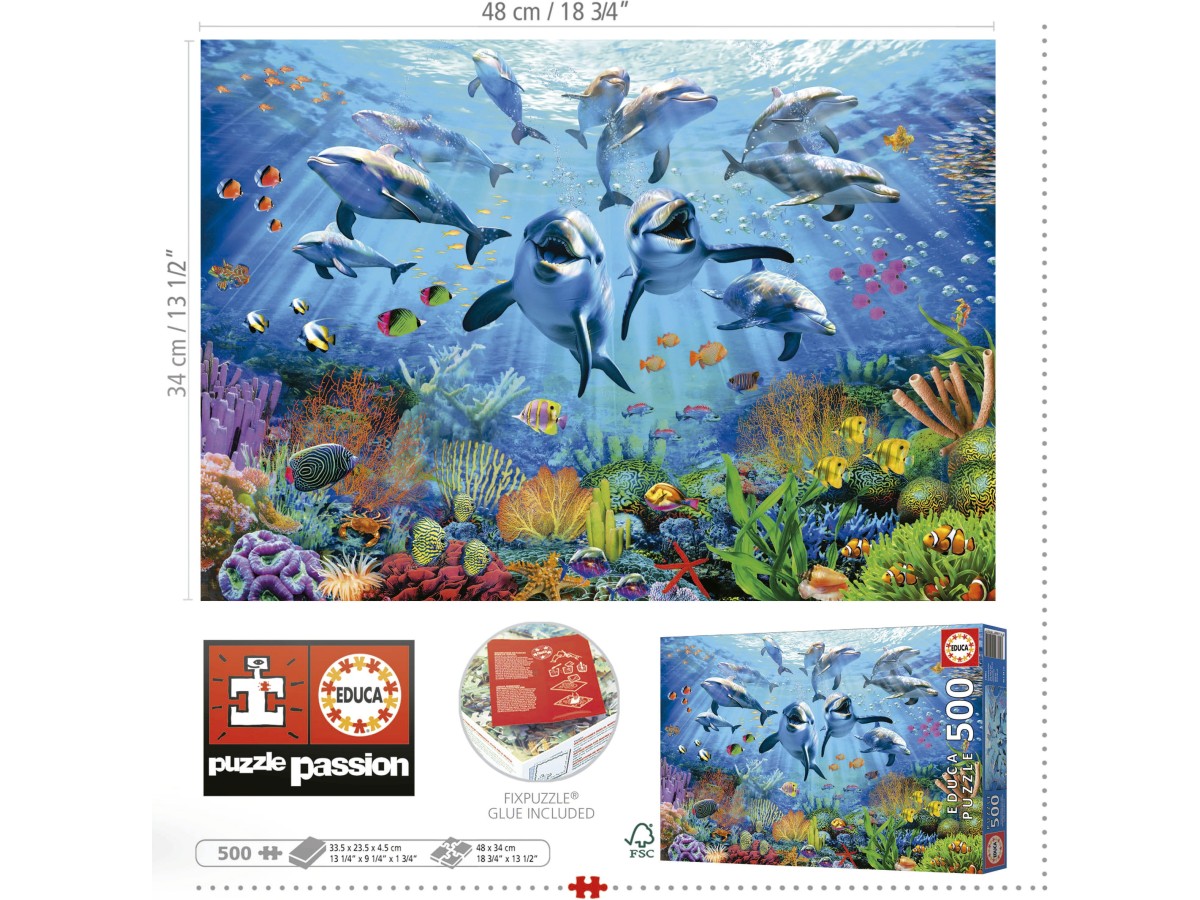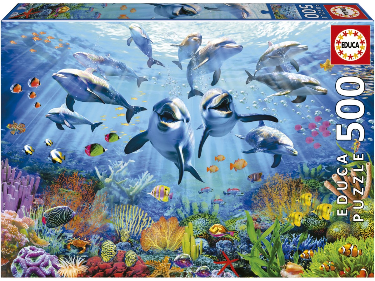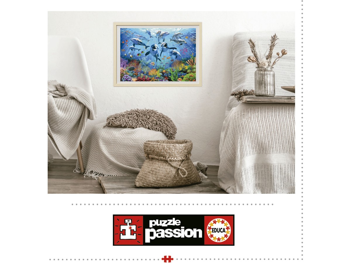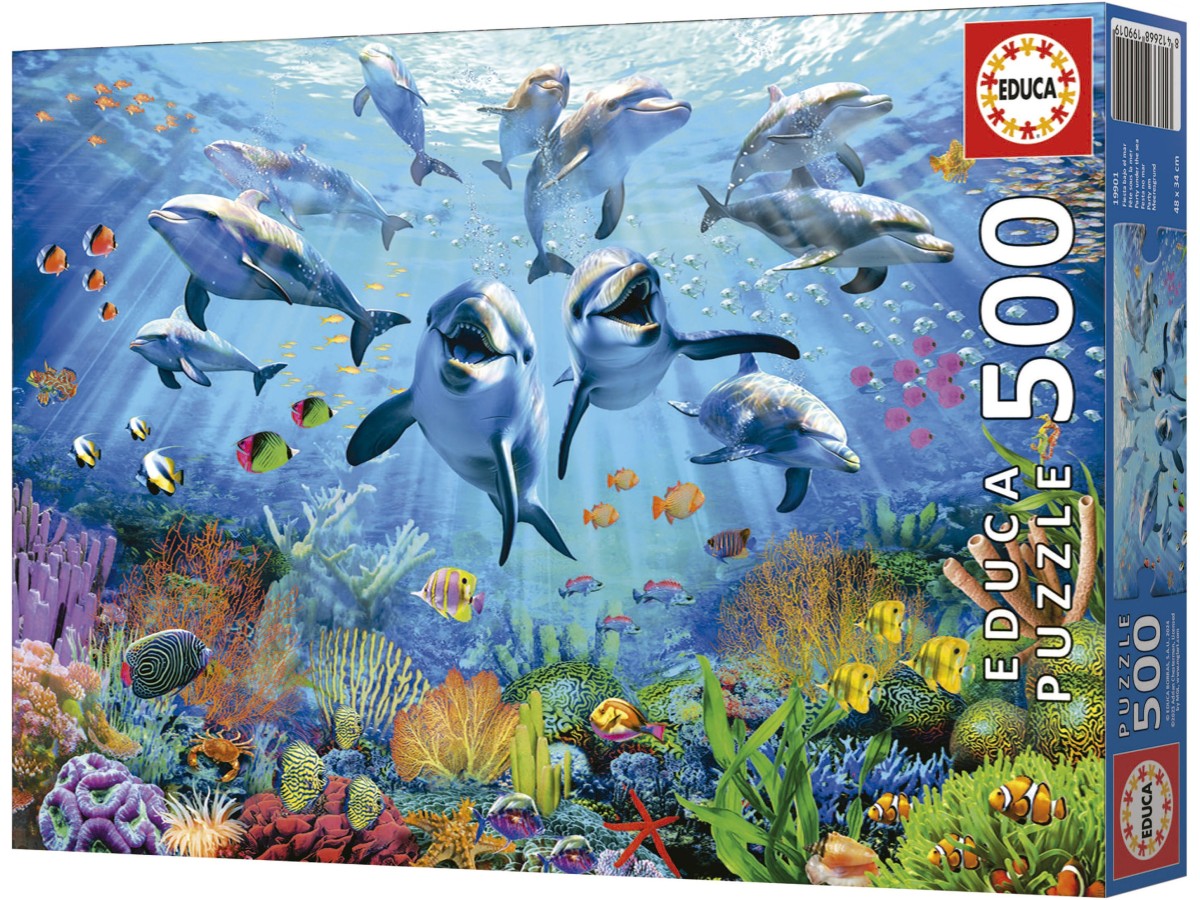 Acest puzzle cu 500 de piese Educa - Party under the sea (Educa-19901) te va purta într-o călătorie subacvatică fascinantă. Ilustrația digitală vibrantă surprinde o scenă plină de viață și culoare, unde un grup de delfini jucauși se distrează în apă, alături de diverse specii de pești tropicali. Reciful de corali din fundal completează tabloul cu o paletă variată de culori, oferind o imagine captivantă a biodiversității marine, iar efectele de lumină aduc un plus de spectaculozitate întregii compoziții.